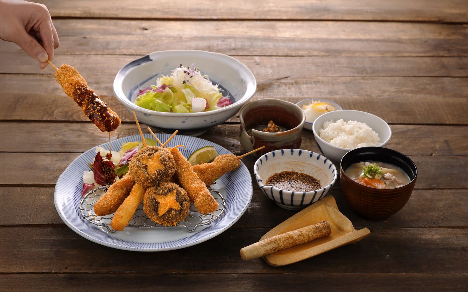 開幕期間,南港店推出獨家限定的「六揚勝串炸套餐」(490元/份),一次集結雪巖雞胸與腿肉、豬眼鏡肉、腰內肉、香菇、筊白筍共6款串炸,搭配醬油麴或鹽麴醃漬後酥炸,風味鮮明,尤其雞胸與腿肉多汁不柴。特別選用的「雪巖雞」強調友善空間養殖與自然熟成,肉質相當甜嫩。