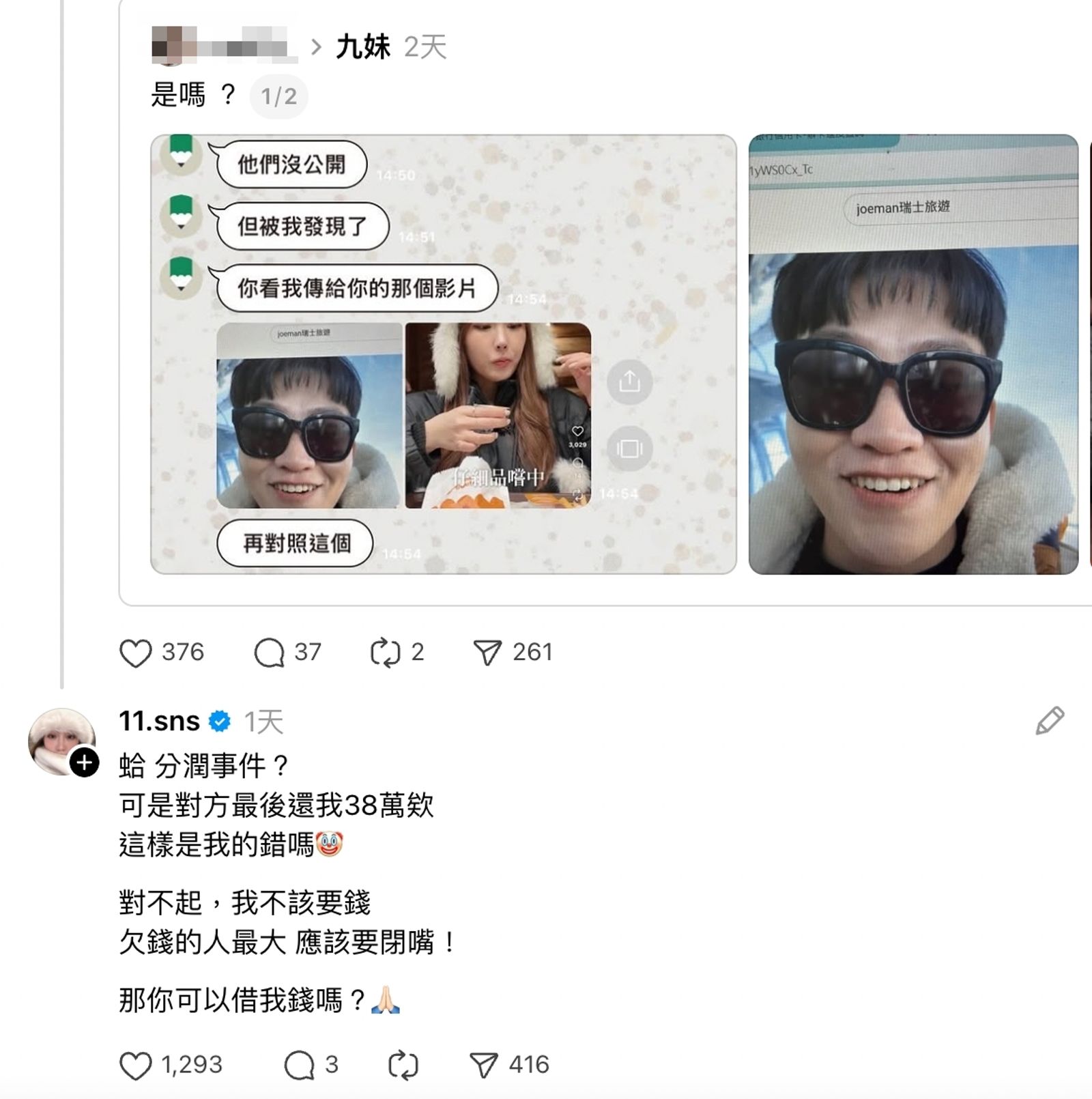 有網友在Threads表示得知 Joeman疑似新歡是蕭伊後「笑不出來」,並提及她與前任的蝦皮分潤糾紛、團購假鞋等爭議。對此,蕭伊直接回擊:「分潤事件對方最後還我38萬,這怎麼會是我的錯?」針對假鞋爭議,她指法院已認定「團購主並不知情,因此未涉販售假貨、詐欺」,並強調惡意造謠內容已截圖,後續將委託律師提告,態度相當強硬。