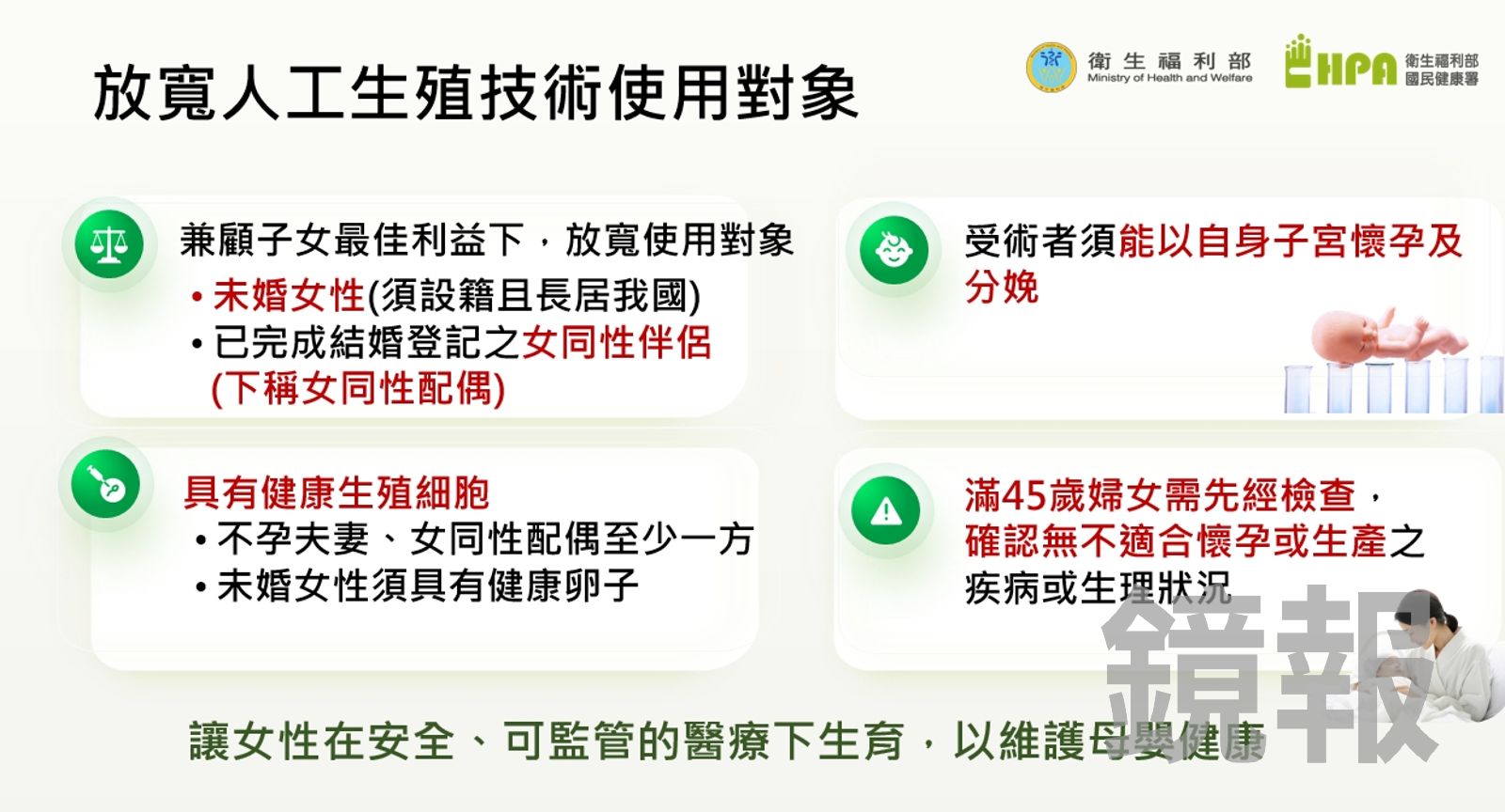 另外,衛福部說,同性婚姻部分,須符合憲法78號解釋文合法登記,且使用自身子宮、卵子生產,也就是僅女同志適用,因男同志可能涉及代孕議題,因此暫未納入;未婚婦女應年滿18歲、適合人工生殖,且使用自身卵子和子宮。