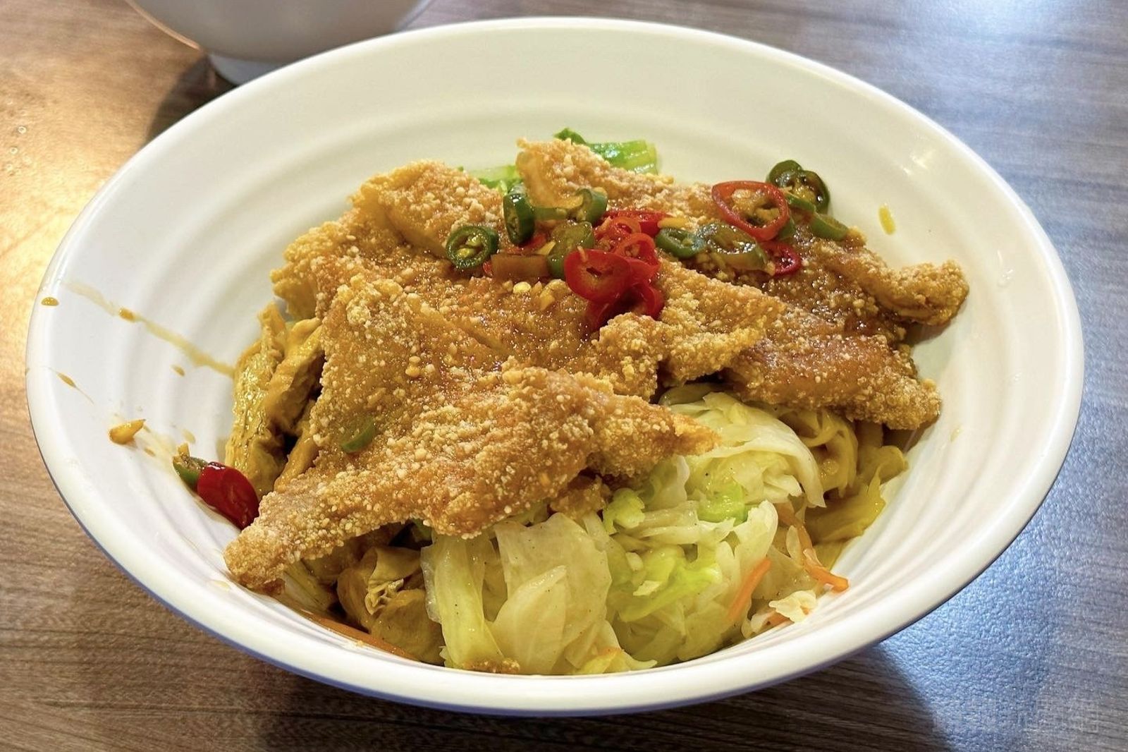 這裡的「排骨飯」(110元/份)是古早味作法,麵皮有顆粒感但不油,肉質軟嫩。最加分的是上面會淋上一點甜甜的辣椒醬汁,辣味溫和,香氣濃郁,讓整塊排骨更夠味。