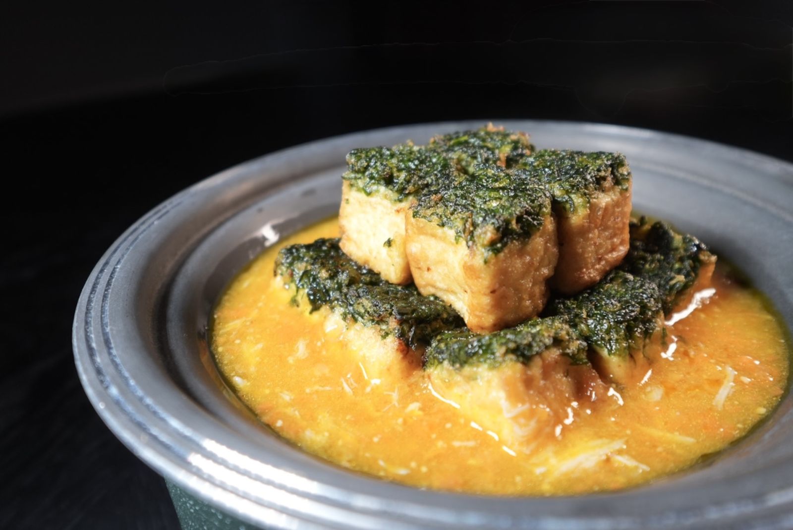 極為費工講究的,還有「大閘蟹粉手作菠菜豆腐」(580元/份)。以新鮮菠菜打泥混合蛋白蒸製豆腐,底部略煎至金黃,上層淋上以大閘蟹蟹黃與蟹膏炒製的蟹粉醬,蟹香濃郁,鹹鮮收斂。餐廳目前是試營運階段,氛圍靜謐低調,無論是家庭聚餐或高端宴客,皆可在其中尋得合適節奏。