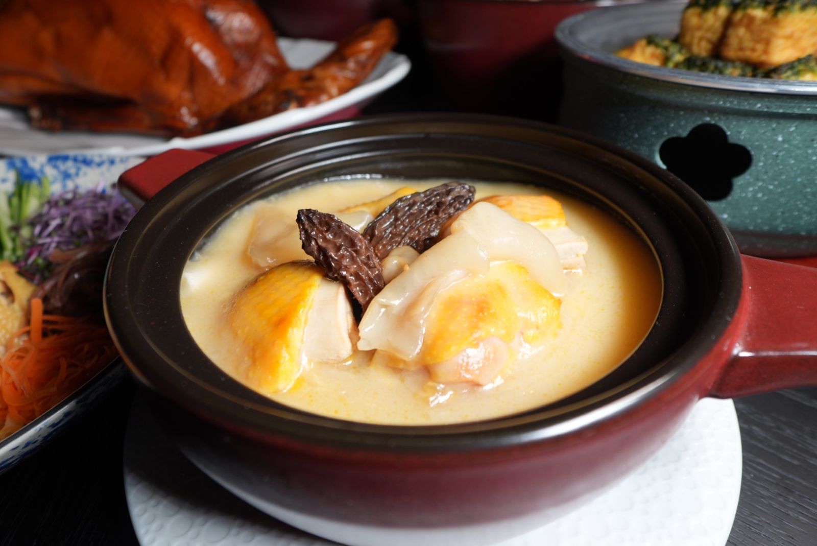 另一道鎮店之寶,是需預訂的「砂鍋羊肚菌花膠桶濃雞湯」(1,080元/每人)。這道湯品用老母雞、玉米雞與金華火腿慢火熬煮8小時,湯頭乳白濃郁。湯中還加入頂級花膠與羊肚菌,入口滑順,回甘醇厚。