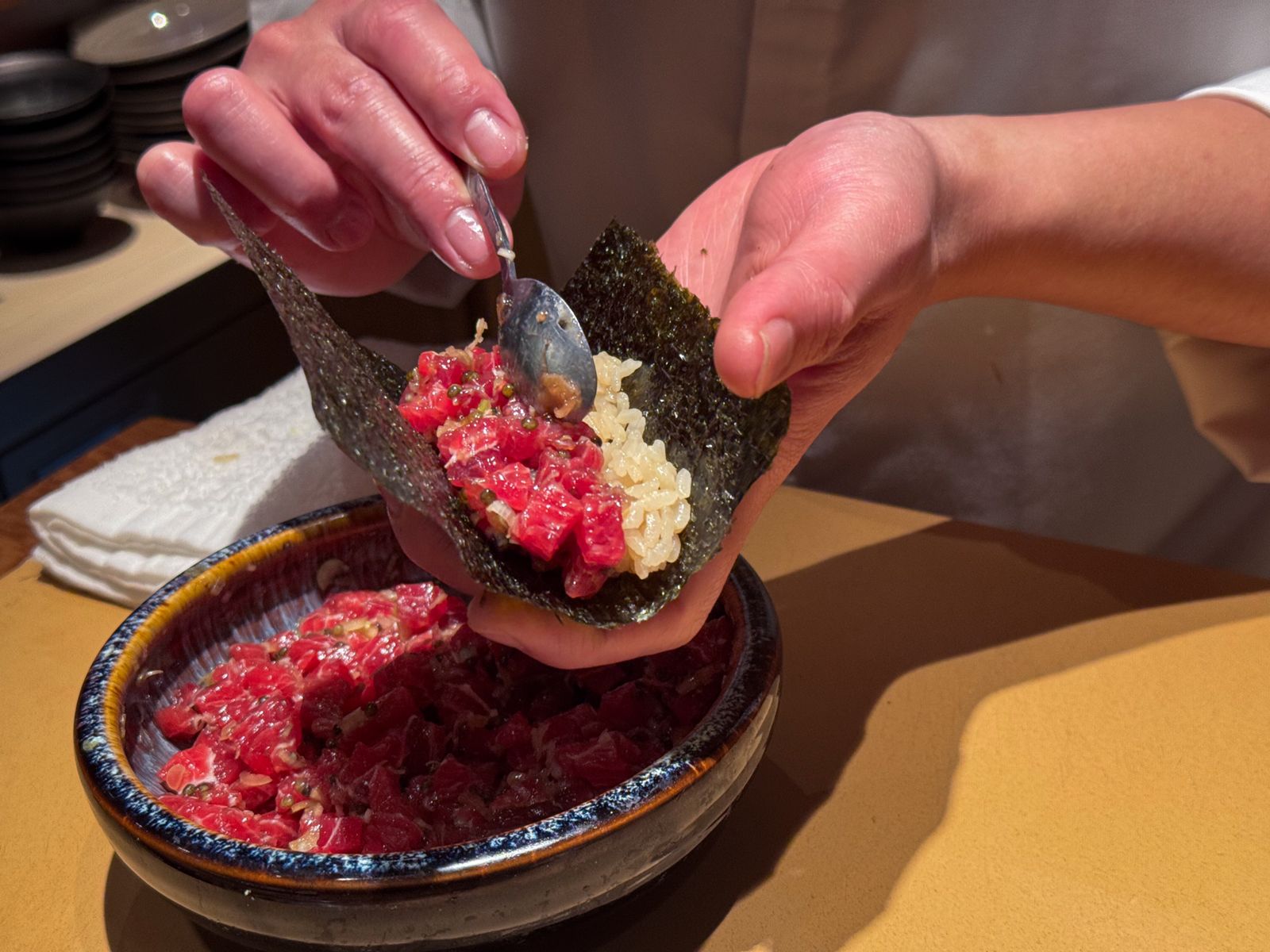 黑鮪魚赤身帶有宜人的鮮酸,切丁做成塔塔手卷或捏成握壽司都相當腴嫩甘美,大腹則有豐潤飽滿的油花,入口即化有如海中和牛。