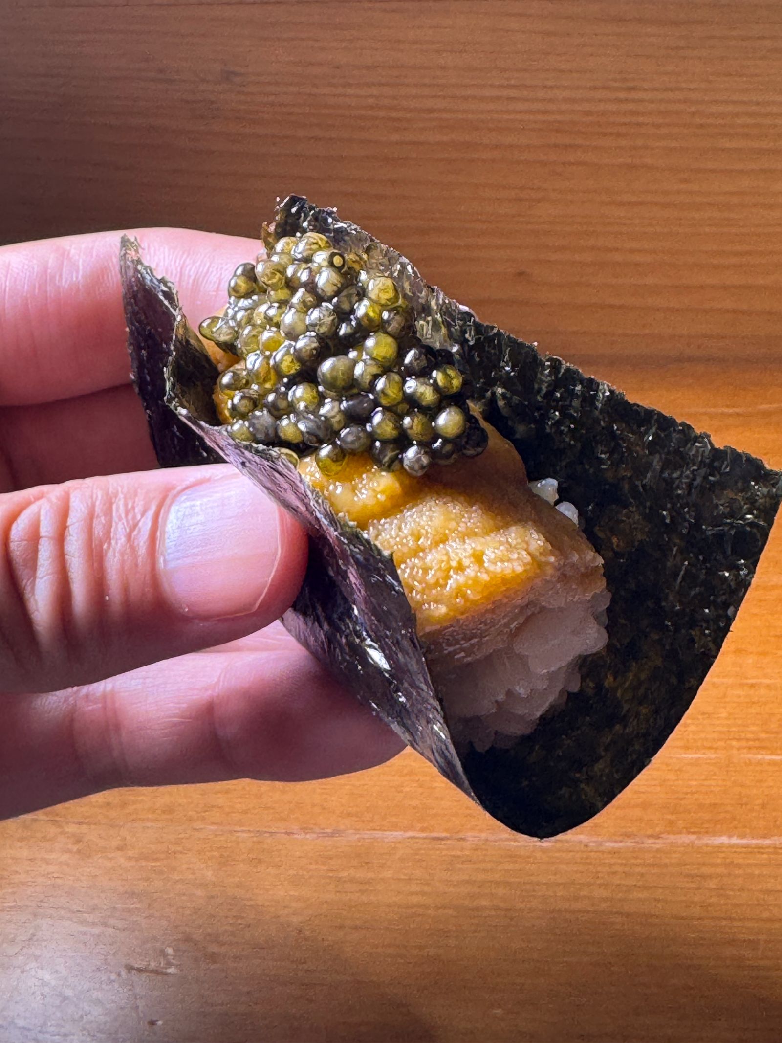 此外,餐廳從2024年起攜手「Royal Caviar Club」,成為亞洲唯一獨家供應Ossetra黃寶石魚子醬的日料品牌。魚子醬取自9至10年成熟的俄羅斯鱘龍魚,鹽度低、色澤墨綠,帶有堅果與奶油香氣,可搭配赤海膽手卷、黑鮪魚大腹、龍蝦與鮑魚等高級食材,為料理畫龍點睛。現場亦提供魚子醬加點優惠,每10公克僅600元。
