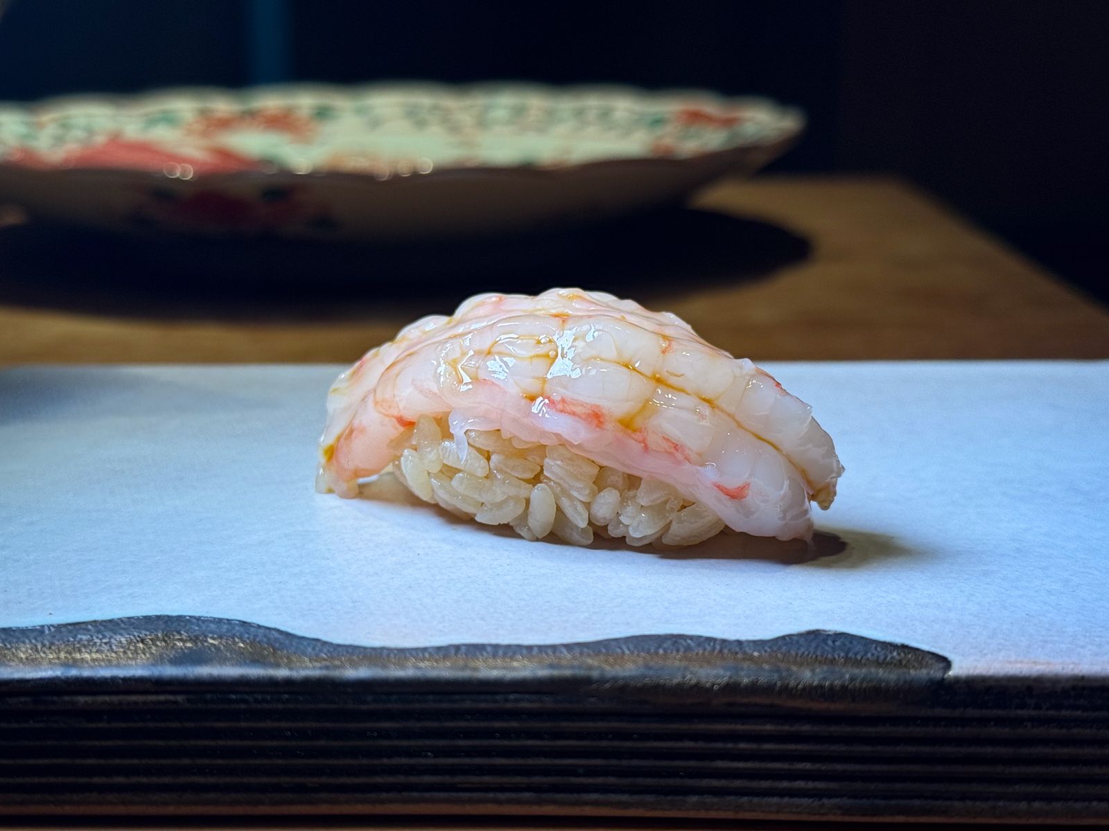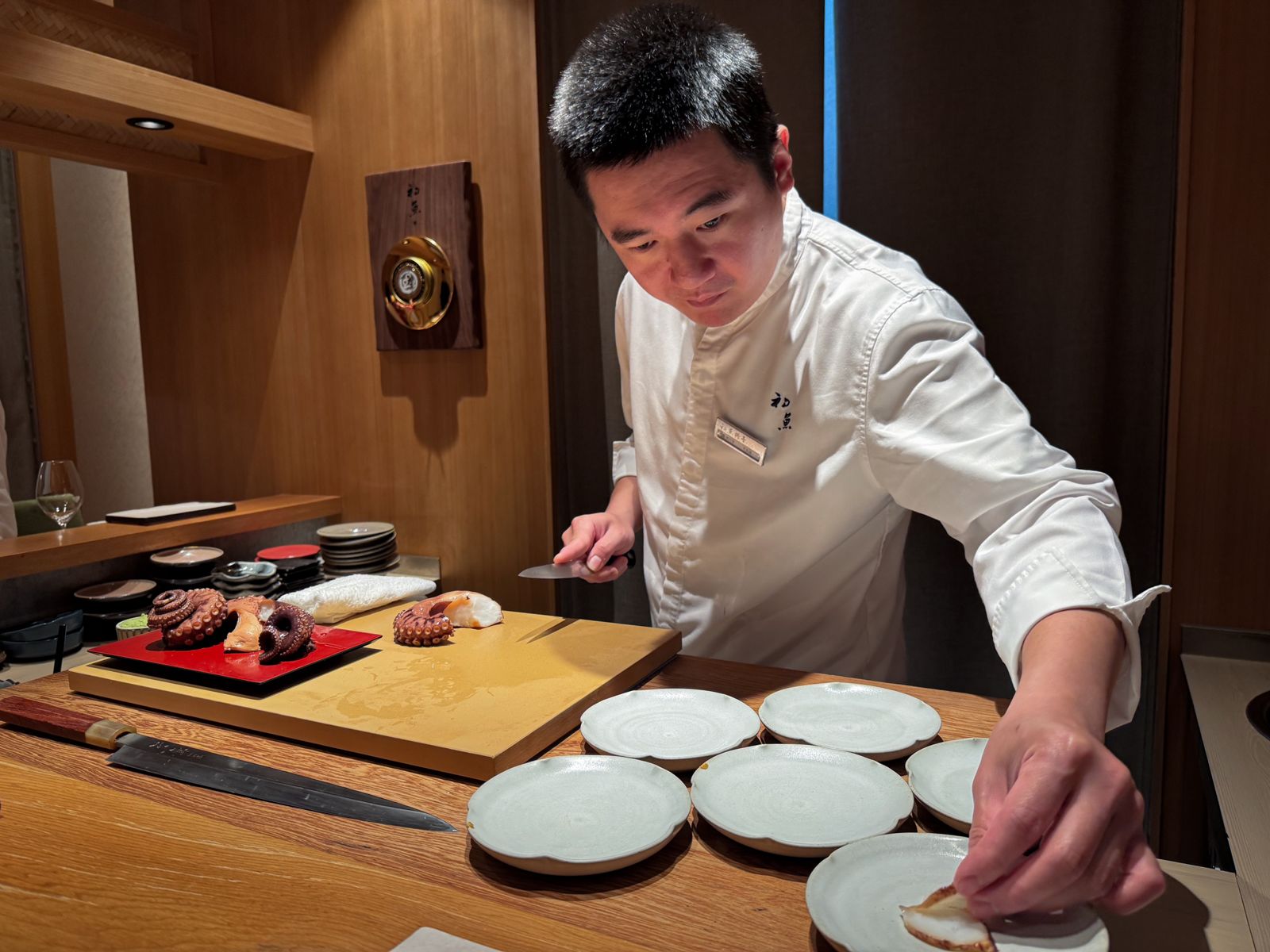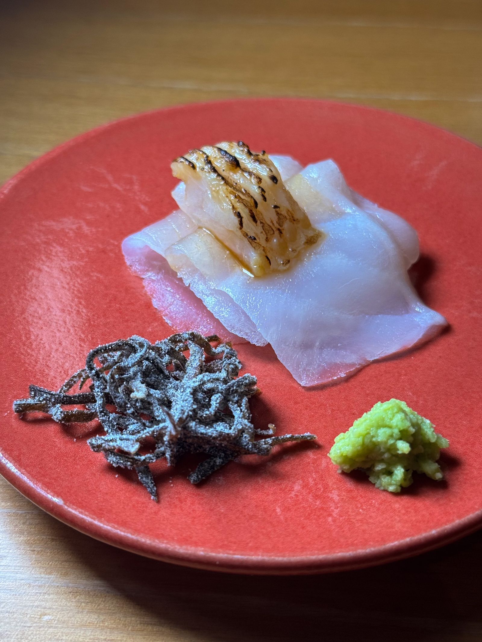 不僅壽司講究,單品料理亦展現豐富的創意與匠心。來自明石瀨戶內海的章魚,觸手短而壯碩,採半生熟方式保留Q脆;北海道鮫鰈魚的鰭邊肉與魚身一脆一嫩,形成絕妙口感對比。