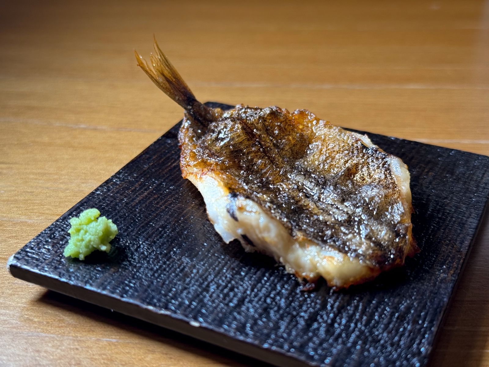 靜岡深海魚目光魚則經繁複去刺後烤製,口感外脆內嫩、魚味集中,是一款相當費工的下酒菜。