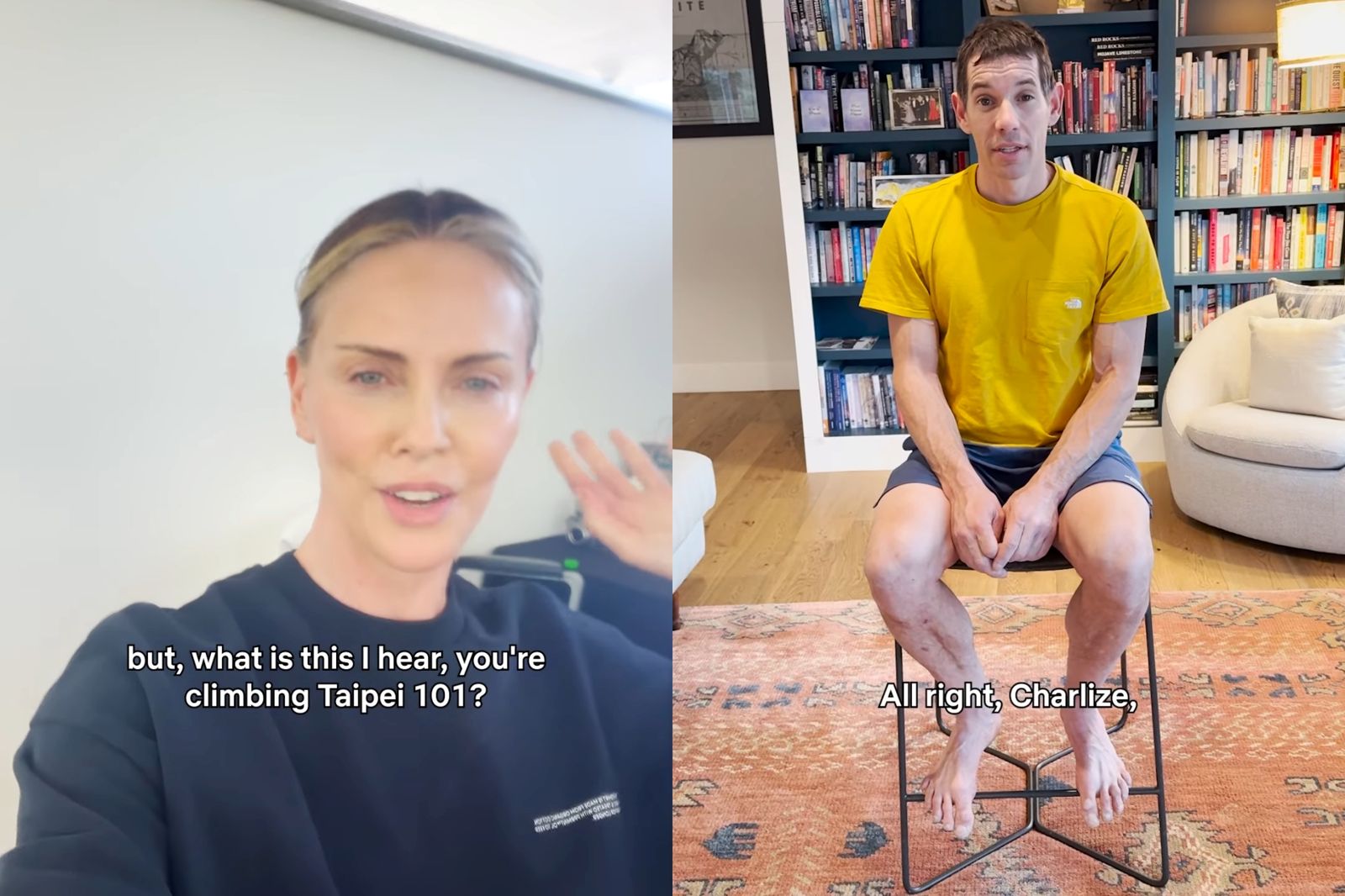 畫面中,莎莉賽隆驚嘆對方的驚人膽識,對著霍諾德喊話:「我的朋友,聽說你要攀登台北101,還有什麼是你不爬的嗎?」 隨後她話鋒一轉,透露自己為了新片也接受了攀岩訓練,並當場示範將椅子當成抱石岩點,穿梭其中的靈活身手讓粉絲大感驚奇。這場充滿創意的較量,也與明天即將登場的天際線生死戰形成強烈反差。