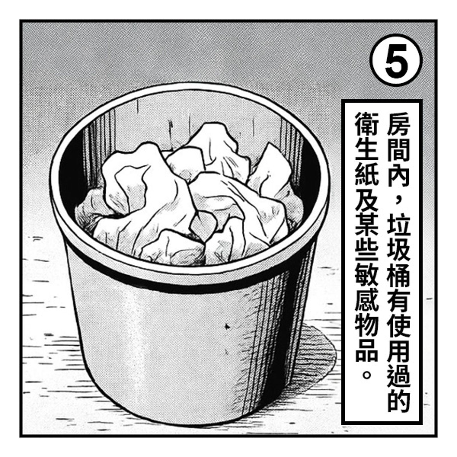 拍照的同事提醒我:「垃圾桶快看一下。」我一看──有幾團用過的衛生紙,還有一樣⋯⋯垃圾桶裡的東西……我們就不多說了,只能說比驚喜包還驚喜。當時,我們覺得這是非常關鍵,但實在不好明說的物品。