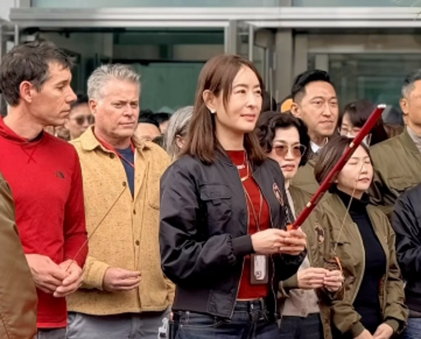 賈永婕於21日帶著霍諾德與幕後團隊,在台北101大樓前以中、英文進行雙語祈福儀式,桌上可見象徵活動、機器一切正常的乖乖,以及各式水果。