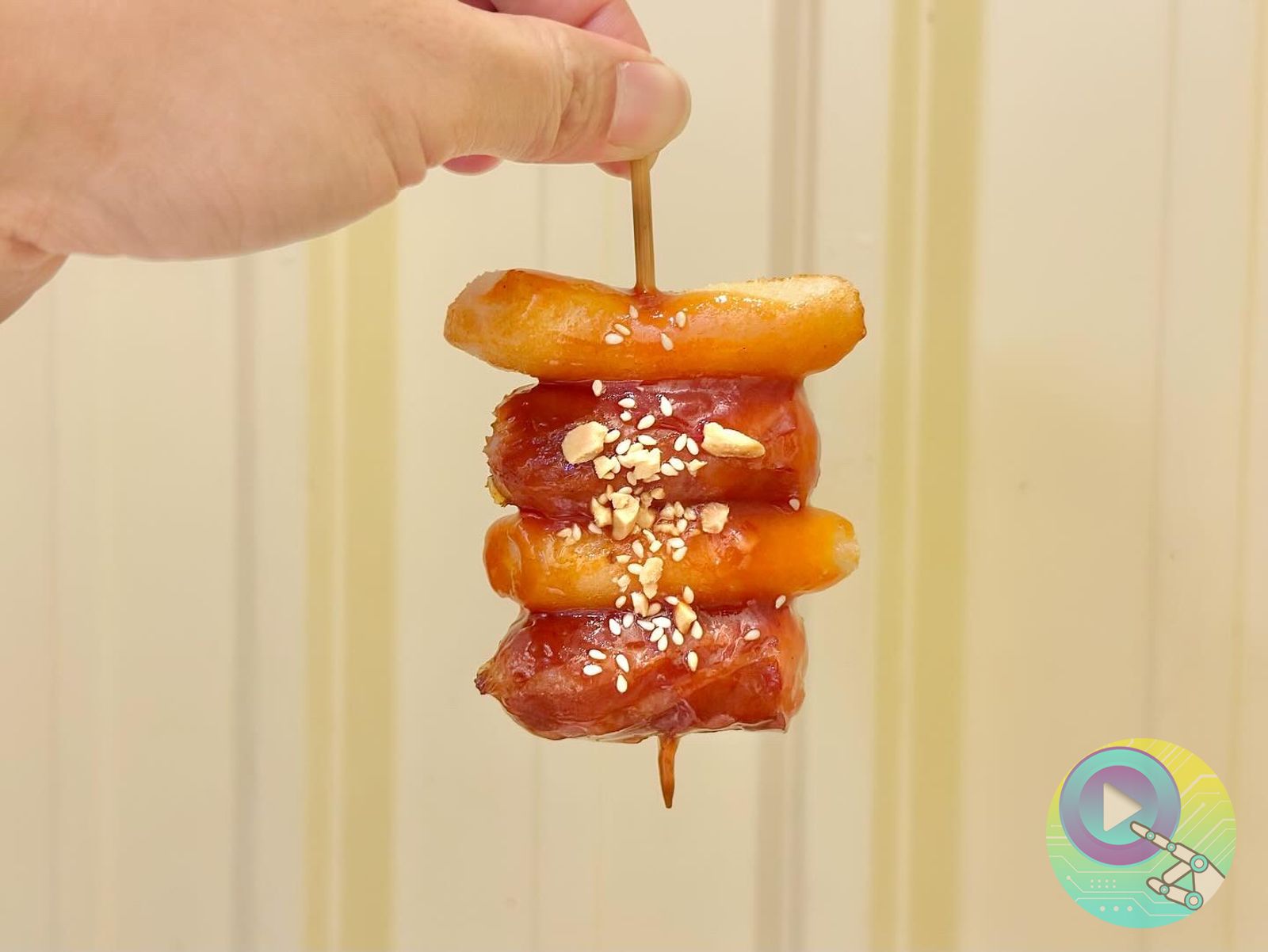 讓我特別驚喜的是「SOTOK SOTOK」(50元/份),這是近年在韓國街頭很流行的小吃。是用德式香腸和年糕交錯串起來炸,再淋上甜甜的韓式醬料。因為年糕味道比較單純,搭配鹹香多汁的香腸很剛好,吃起來有Q有脆。