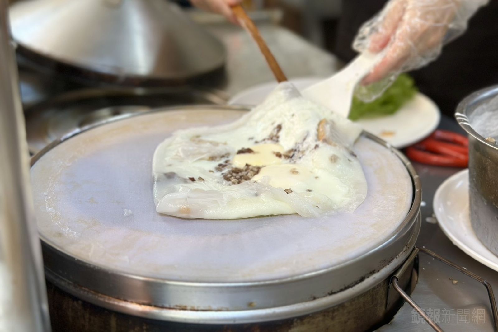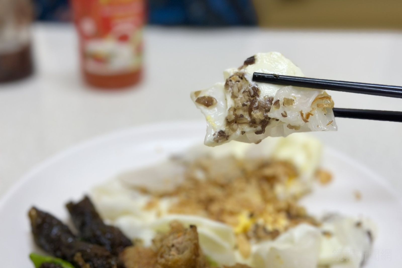老闆娘堅持每份現點現做,口感才會夠Q彈。推薦「蛋包半熟腸粉」(80元/份),用白色米漿淋在蒸盤上後打上兩顆雞蛋,搭配豬肉末、越南火腿和黑木耳碎,蒸熟後再撒上油蔥酥。