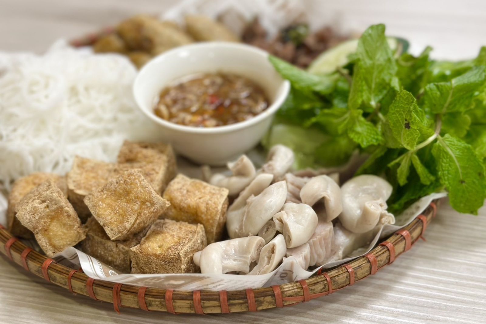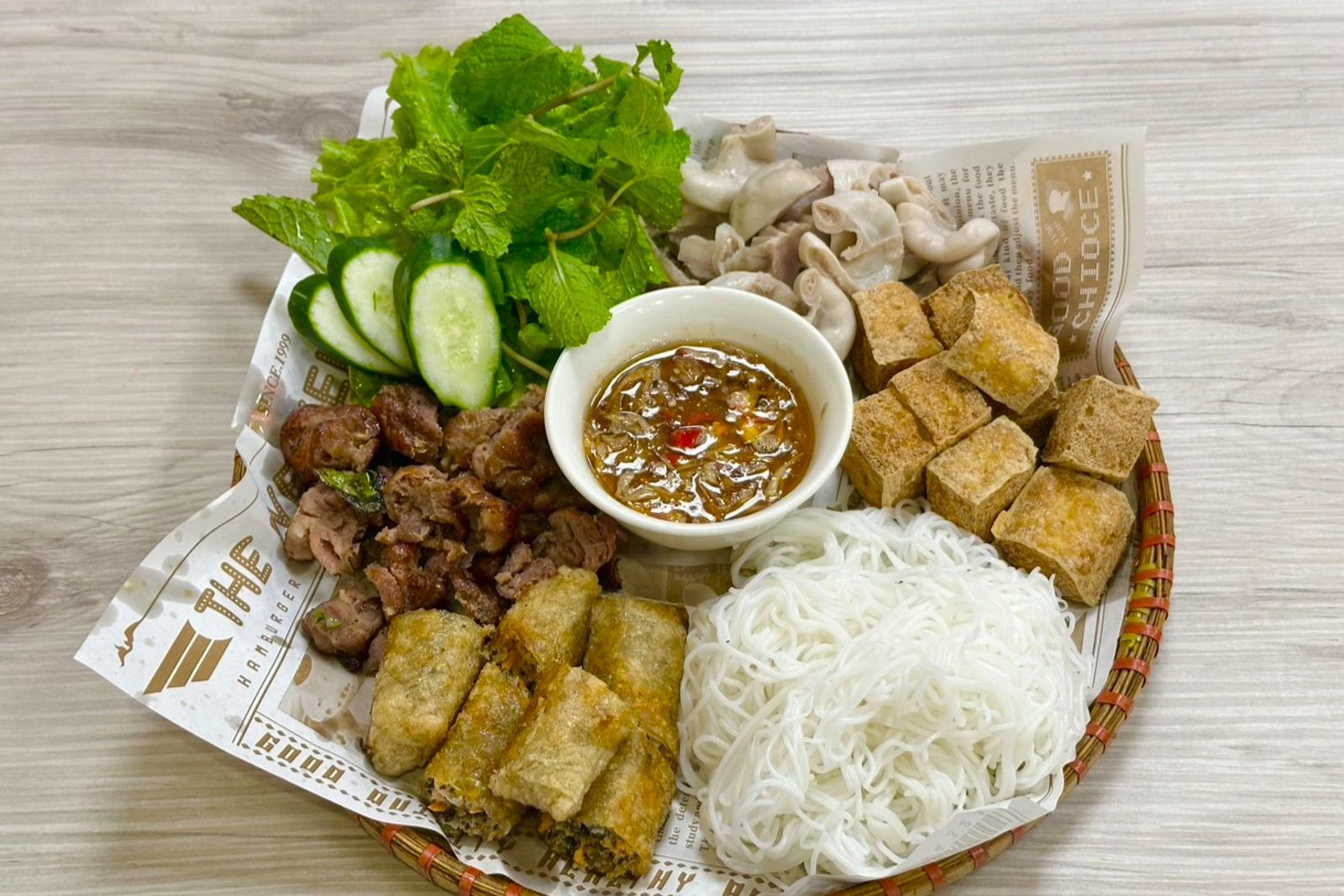 內容很豐盛,有越式烤肉、炸春捲、炸豆腐、生腸與米線,配上店家自製的蝦醬沾醬,鹹甜濃郁、香氣特殊,用生菜和薄荷葉包著吃清爽又過癮。