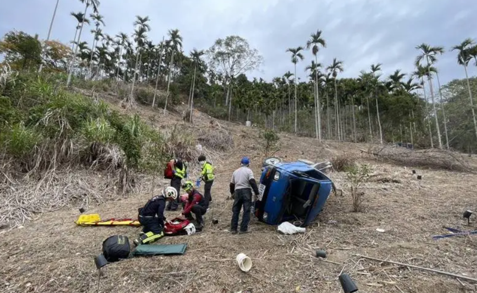 目擊民眾描述,小貨車墜落的地點距離上方道路約有30公尺遠,整輛車重重栽進山谷下方的農田內。強大的撞擊力道導致貨車翻覆,零件散落一地,現場慘不忍睹。