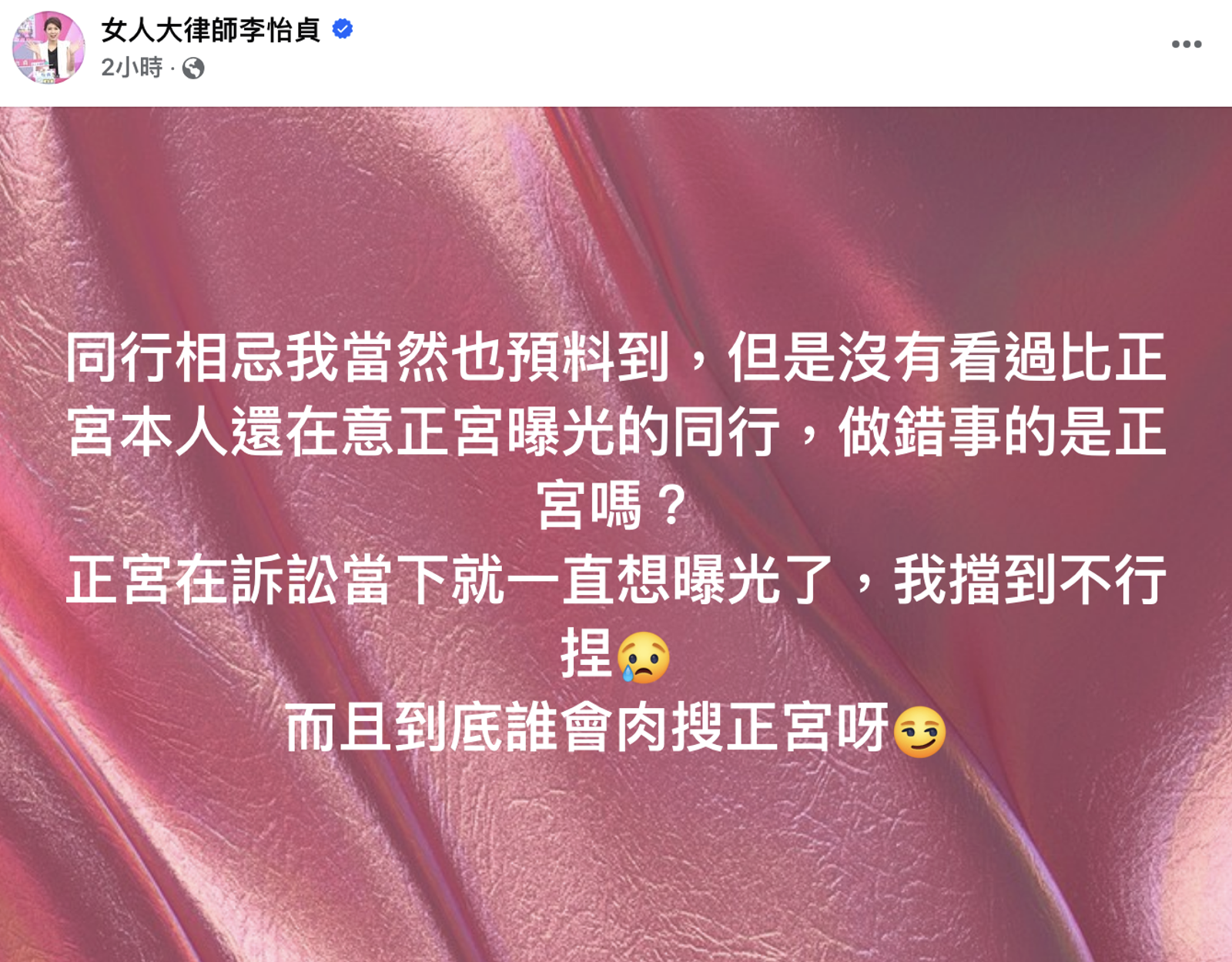 近日啦啦隊女孩成富商小三的話題在網路上討論不斷,律師李怡貞在節目上爆料,一名樂天啦啦隊女孩涉入與高雄千億望族富商的不倫戀,疑曾懷孕墮胎並收千萬和解金,引發熱議。不過,今(31日)她再度在臉書透露訊息,正宮從來沒跟小三和解。