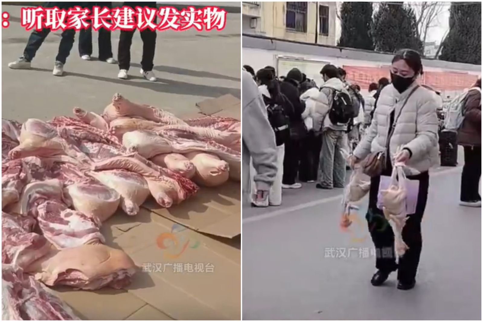 從中國網路上流傳的影片可以看到,有的學生一手掛著一隻魚,一手提著一隻鴨,也有學生直接扛起半隻豬、整隻羊,就這樣從學校單位領走屬於自己的獎品,準備帶回家幫年菜加點菜。