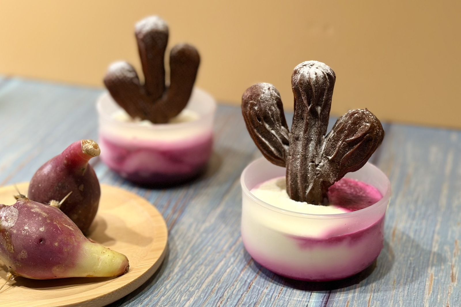 甜點「掌心朵朵」(128元/杯)是在底層鋪上仙人掌果醬與cream cheese,再插上一顆可愛的仙人掌餅乾,萌度爆表,奶香濃郁。