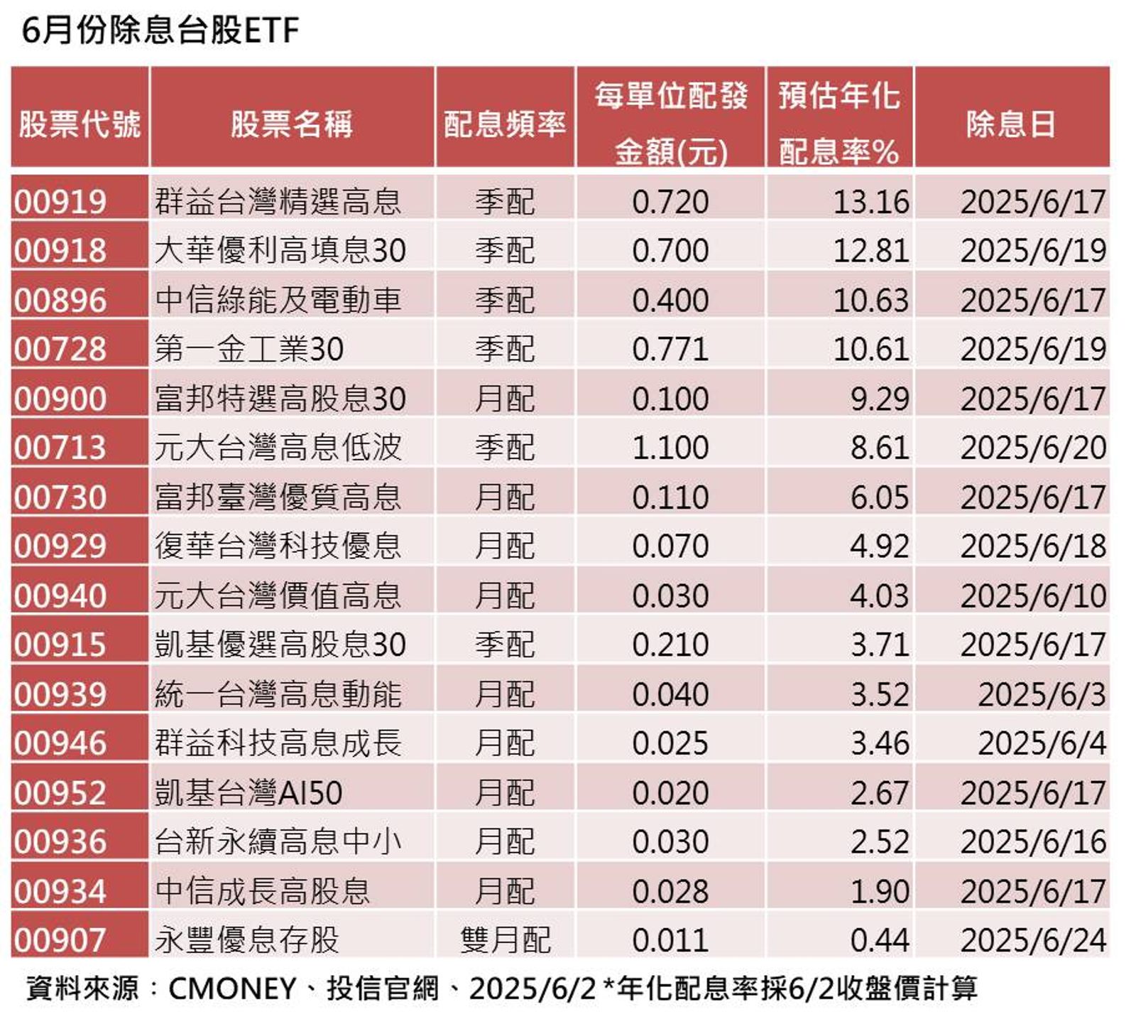 受到投資人歡迎的高股息ETF,於6月最新台股ETF配息公告中,將有16檔要作配息的動作,除息日在6月3日至20日。若以6月2日收盤價計算,有4檔高股息ETF預估年化配息率逾10%。其中又以00919群益台灣精選高息ETF年化配息率13.16%最高,現金穩定入袋。