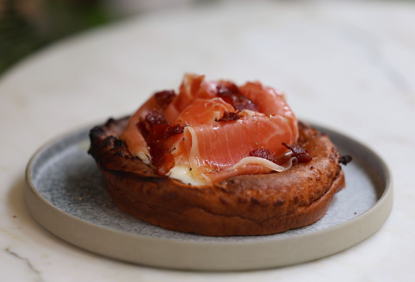 熱力暖場的「生火腿鐵鍋鬆餅」(380元/份)是經典人氣王。現烤鬆餅蓬鬆焦脆,上頭鋪著起司、西班牙生火腿與酥脆培根,淋上橄欖油與蜂蜜,鹹甜交織、香氣四溢,完美喚醒夏日味蕾。