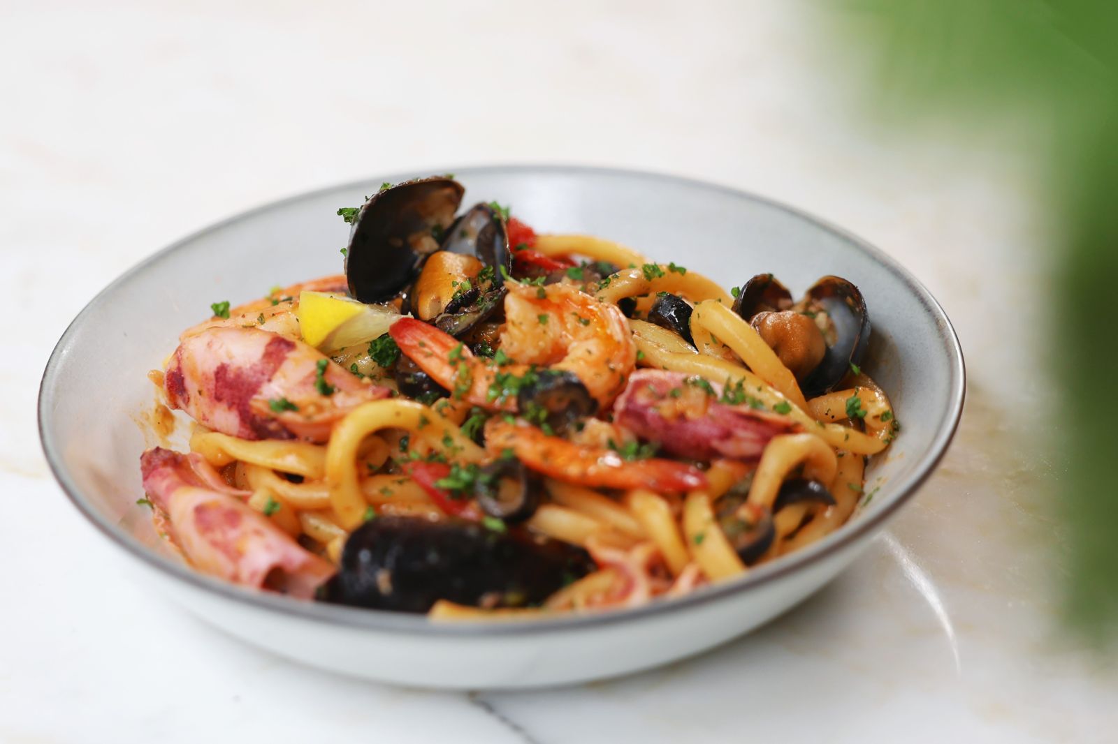 主餐推薦必點「海鮮煙花女中吸管麵」(580元/份),主廚把鮮蝦、小卷、淡菜等海鮮與鯷魚、番茄、酸豆、橄欖等經典配料快火爆炒,風味濃郁,搭配粗短Q彈的吸管麵,每一口都充滿鮮甜海味。