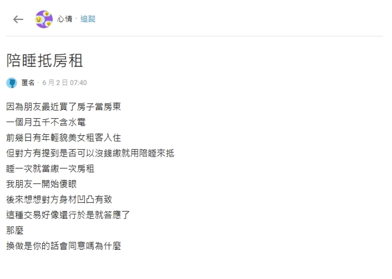 一名網友在Dcard上PO文表示,朋友最近買了房子,開始了當房東的生活,原本開出的租金為1個月5000元、不含水電,前幾日就有一名年輕貌美的女租客入住。不料,這名女子卻提到「是否可以沒錢繳就用陪睡來抵」、「睡一次就當繳一次房租」,讓原PO朋友相當傻眼。