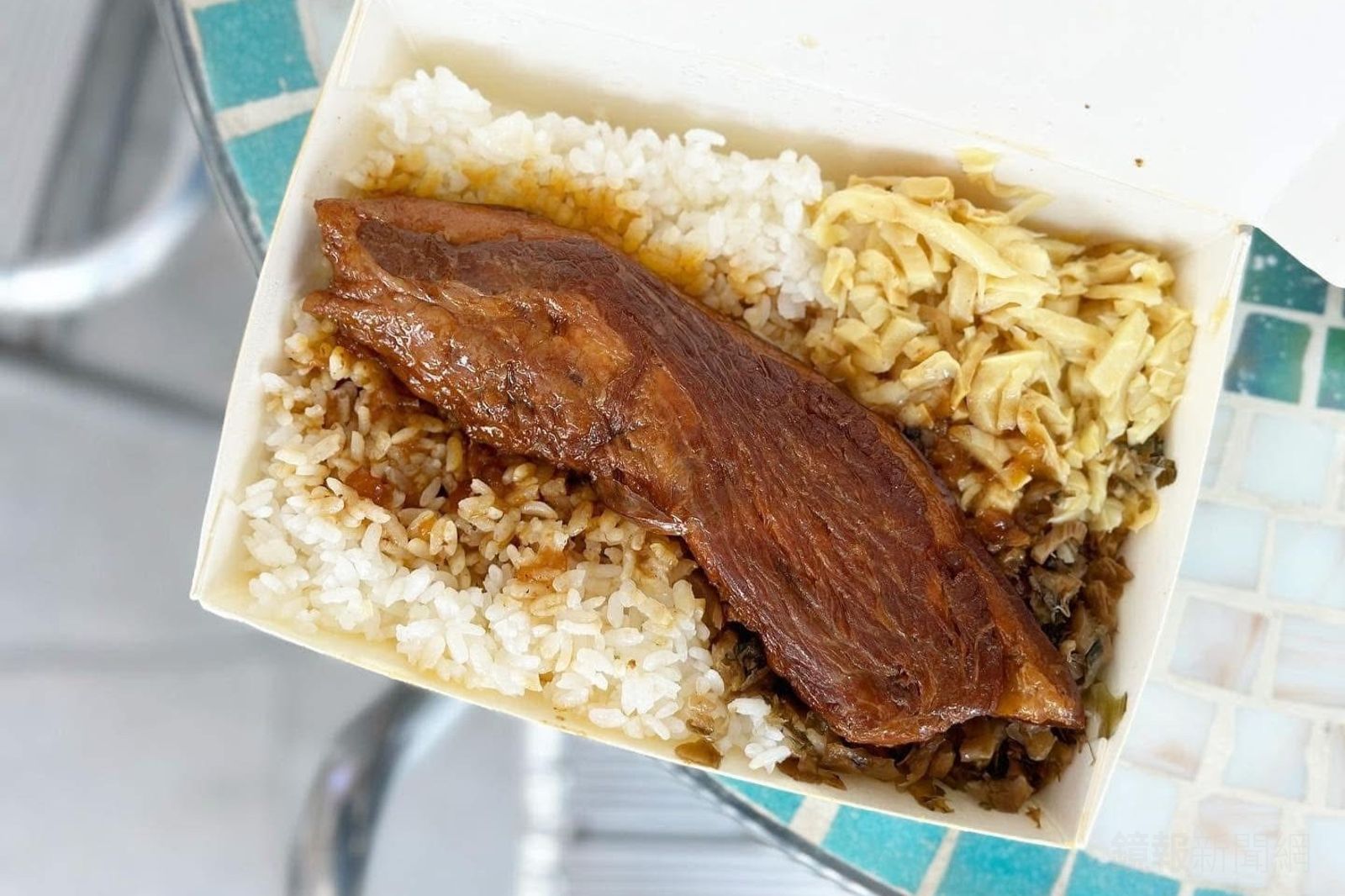 先炸再滷的排骨肉,麵衣變得軟滑,排骨超過1公分厚,但能輕易地用筷子分離,咬起來厚實卻軟嫩入味,甜甜鹹鹹很開胃。配菜有助攻得分,筍絲脆甜,沒有粗糙的纖維感和化學味,酸菜有類似梅干扣肉般的香氣,與肉、飯穿插著吃,更加滿足。