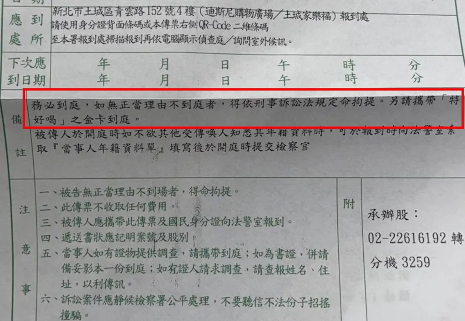 百萬YouTuber丁特日前在社群平台Threads發文,表示自己收到1張被告的傳票,沒想到在備註欄中竟要求他攜帶「特好喝金卡」到庭,讓他大罵:「告我還叫我開庭要帶金卡」、「在搞是不是啊」。文章貼出後立即引發網友討論,丁特也表示將請律師詢問傳票的真偽,對此,新北地檢署回應,單純辦案查證需要,也證實傳票確實是由檢方發出,並非偽造。
