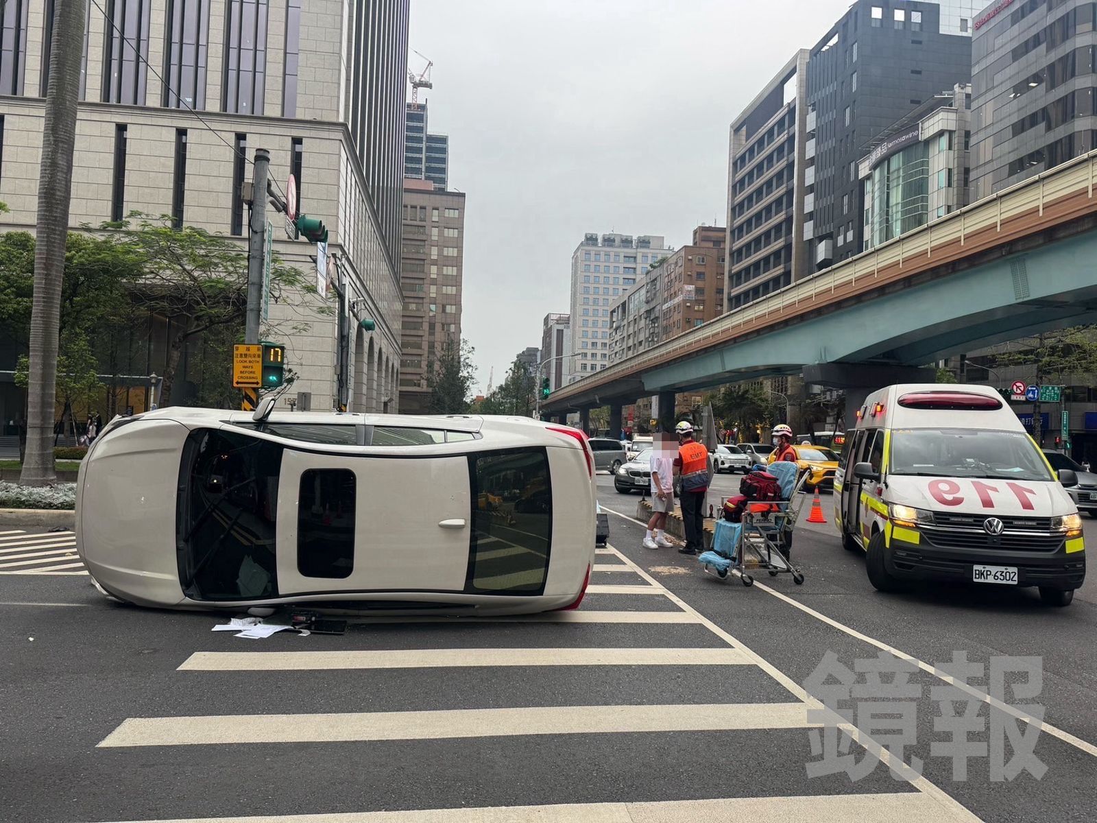 台北市32歲張姓男子昨(16日)下午開車準備前往林口長庚,行經仁愛路與復興南路口時,因路況不熟,在轉彎時不慎猛力撞上行人庇護島,強大撞擊力道導致整輛車當場「向左翻覆180度」橫躺路中央。所幸駕駛命大,事發後自行推開副駕車門爬出脫困,驚險畫面嚇壞不少路過騎士。
