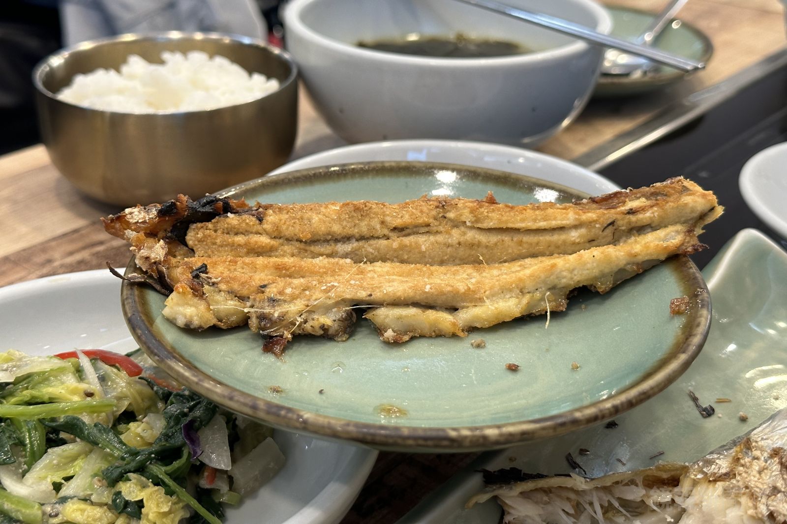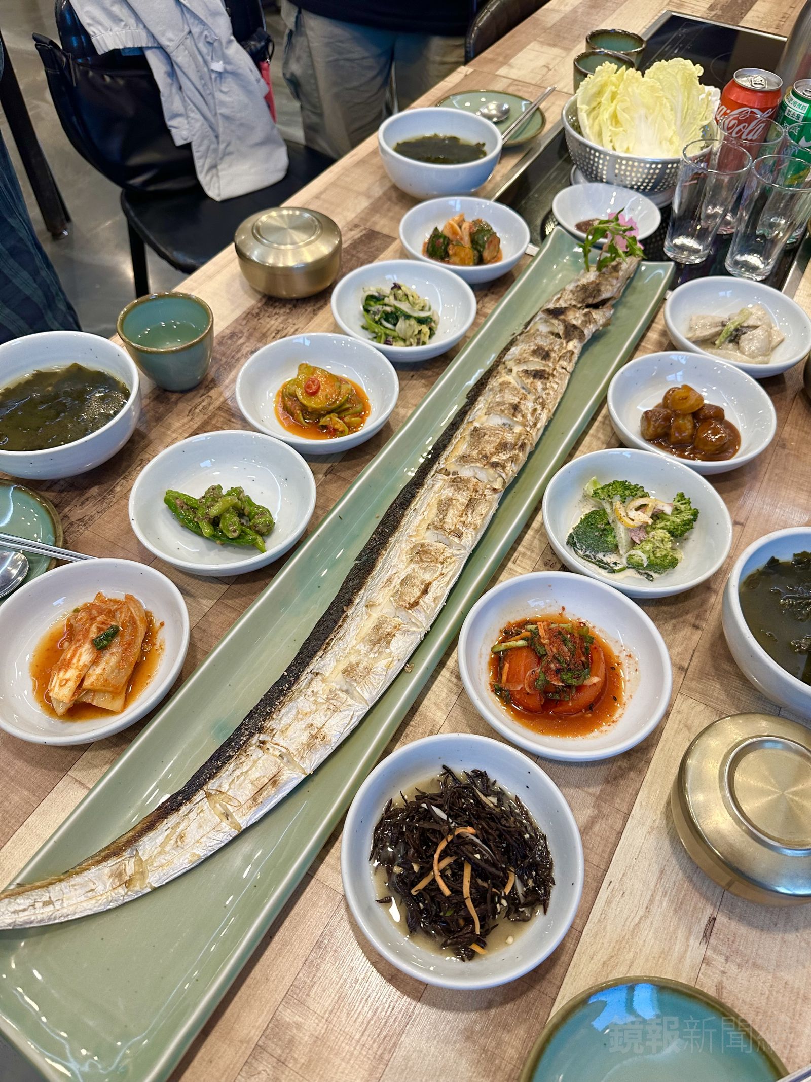 我們點了「3人套餐」(韓幣105,000元,約新台幣2,312元),內容除了主角白帶魚,還附上10款自製小菜、白飯和海帶湯,豐盛得像在辦桌。一整尾白帶魚橫躺在盤上,氣勢逼人,一端上桌會讓人忍不住哇出聲。