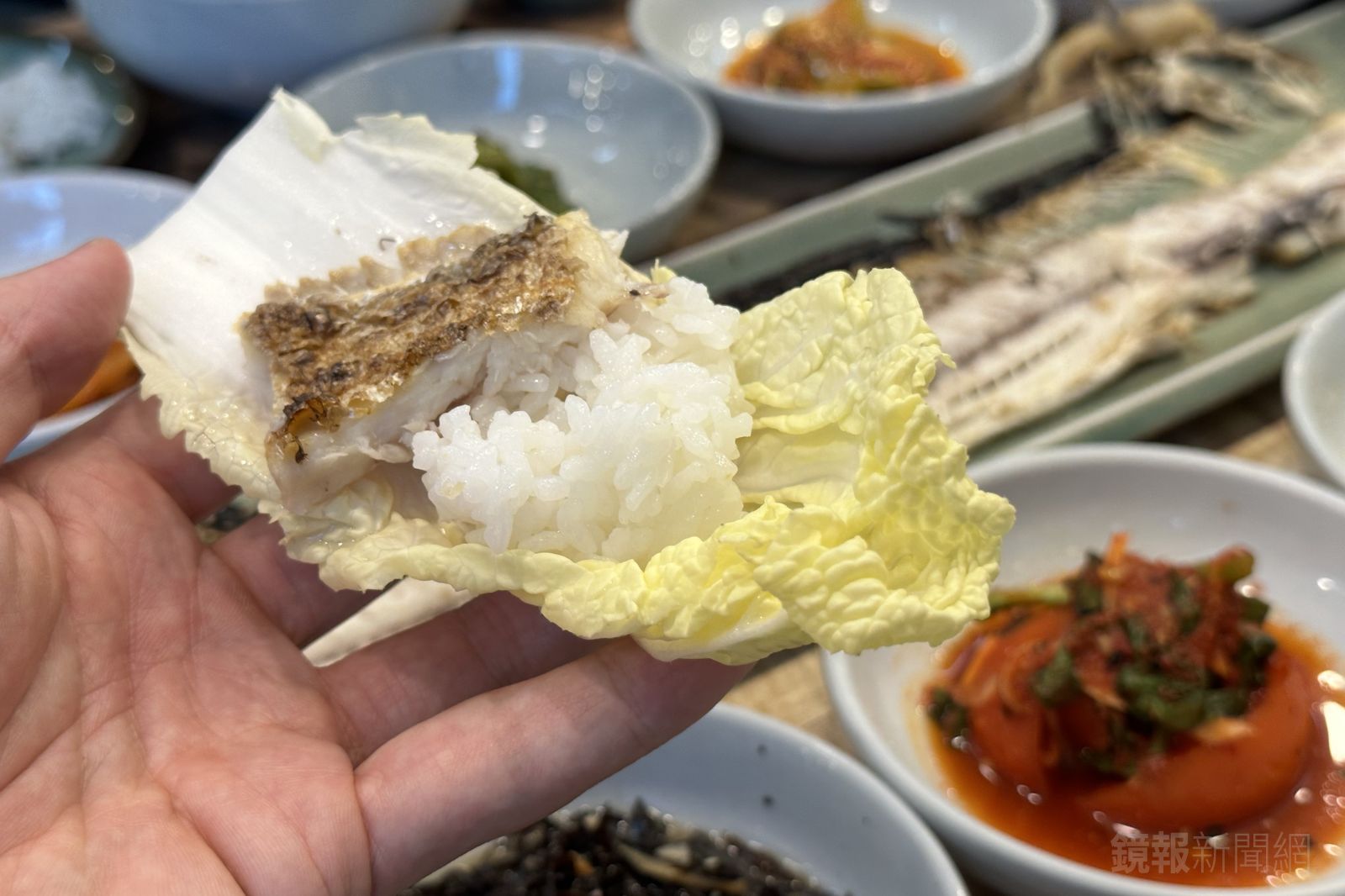 也可以用生菜包著米飯和魚肉,一口咬下清爽又滿足。搭配的小菜也不馬虎,像是辛奇、醃黃瓜、肉丸、花椰菜等,變換著吃完全不膩。