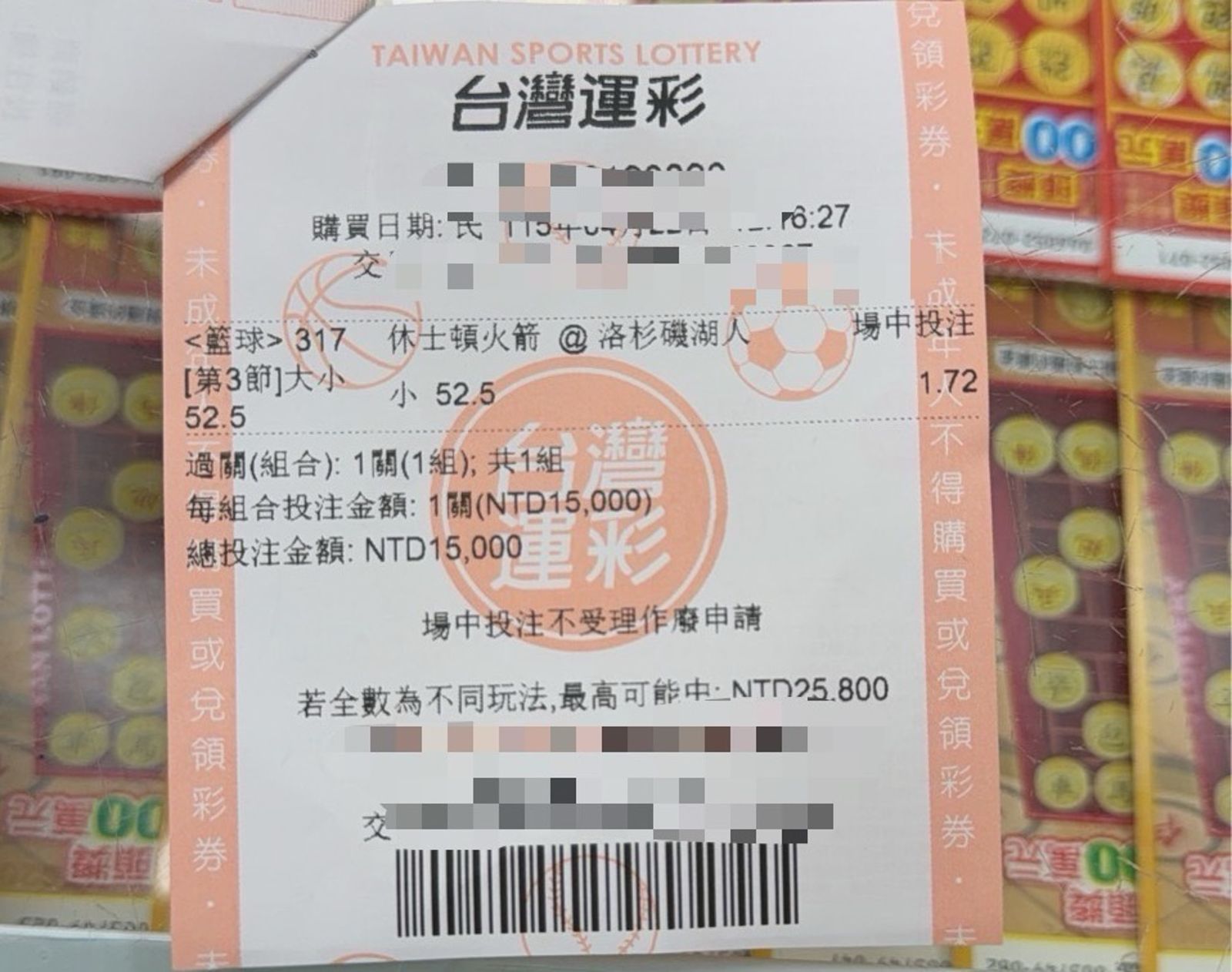 張男昨(22日)中午12時許,前往永和林森路的彩券行,向店家表示要買休士頓火箭對洛杉磯湖人比賽中第3節比分大小的彩券,並且壓了1萬5000元的重注,沒想到下注之後,他卻藉故推托不付錢,且因為下注項目為場中投注,店家無法作廢,最後店家只好打電話請警察到場處理。