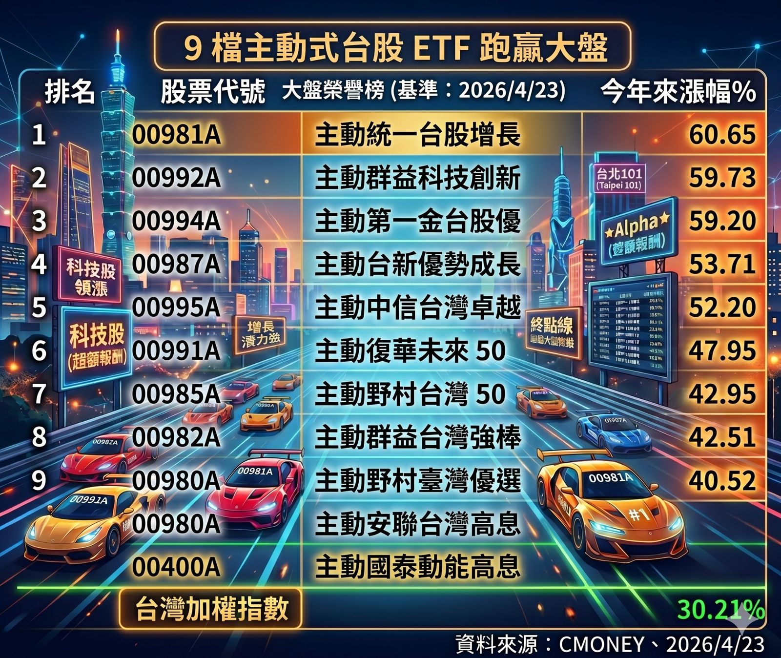 根據統計,截至4/23今年14檔主動式台股ETF平均漲幅達40.96%,前九席個別表現全部打趴大盤。很多投資人可能會問,什麼叫「主動式ETF」?一般ETF比較像照著菜單買菜,指數怎麼走,它就怎麼配菜色;但主動式ETF像請了一個會自己挑菜、自己配菜的主廚。主動式台股ETF經理人會依照市場變化去選股、調整部位。也因為這樣,當盤勢有波動、產業輪動加快時,主動式ETF理論上更有機會抓到補漲股、熱門股,甚至比大盤多賺一段。