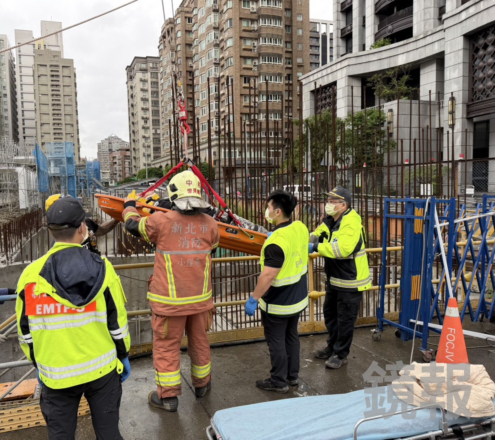 由於現場環境狹窄且傷者疑似骨折,無法自行爬出,工友見狀連忙撥打119求救,消防人員於11時07分抵達現場,評估傷勢後,配合工地現場起重設備進行擔架吊掛作業,順利將兩名傷者拉回地面。