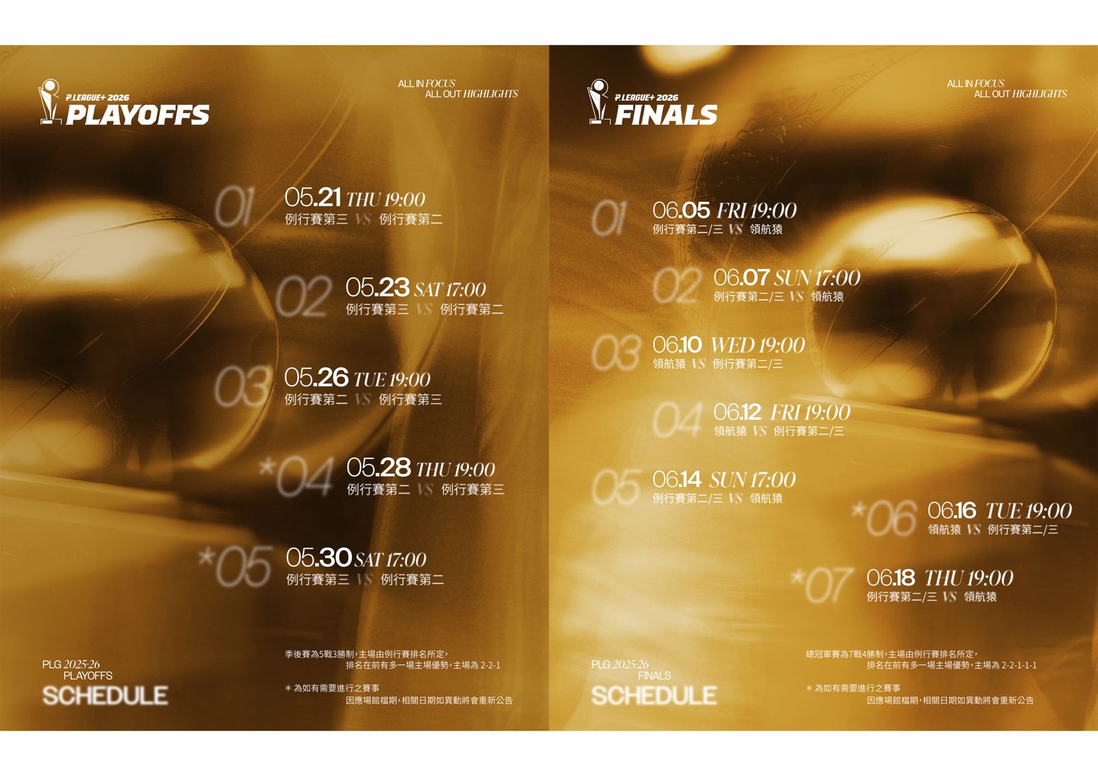 聯盟表示,至於總冠軍賽的部分,賽制為七戰四勝並將於6月5日開打,如果進行到第7戰將於6月18日進行,主場配置為「2-2-1-1-1」,例行賽王者桃園璞園領航猿享有多1場主場優勢。