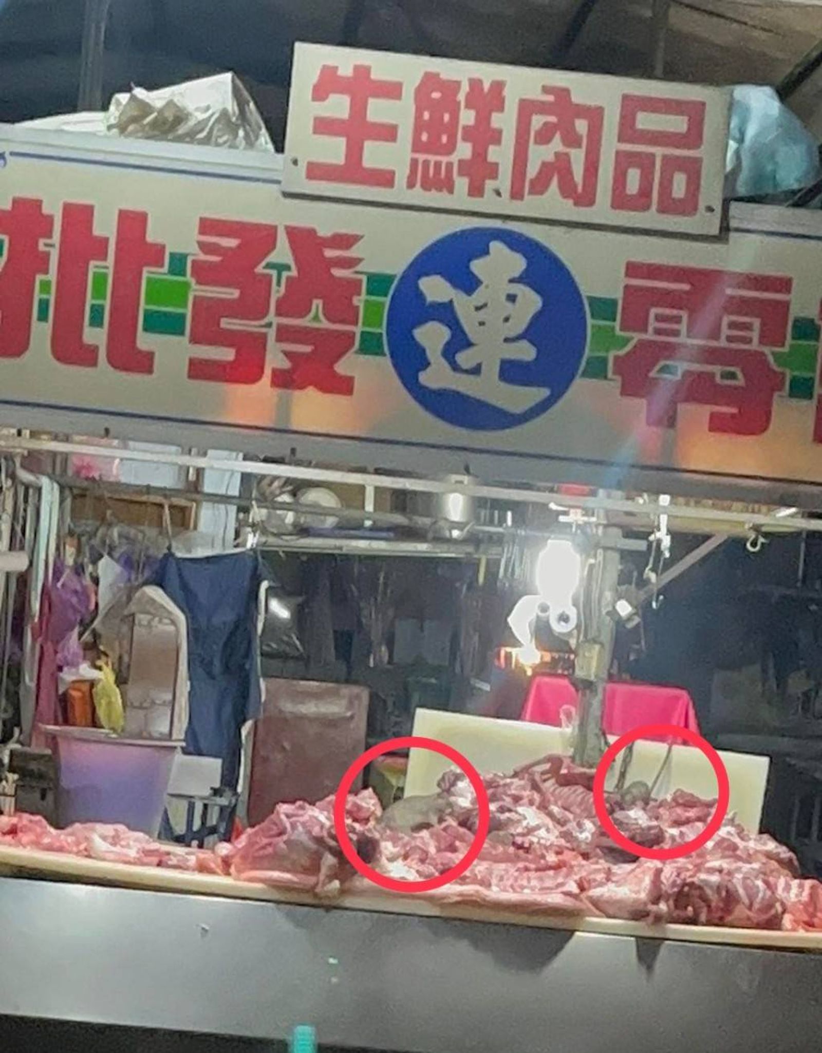 高雄市鳳山區一名消費者昨(23)日凌晨行經鳳山共同市場,目擊令人作嘔的一幕,只見市場內一家豬肉攤層層堆起的「肉山」上,竟有兩隻大肥老鼠在瘋狂啃食,影片與照片流出後引發當地居民高度恐慌。高市衛生局昨日火速前往稽查,當場發現鼠跡,已責令業者限期改善。