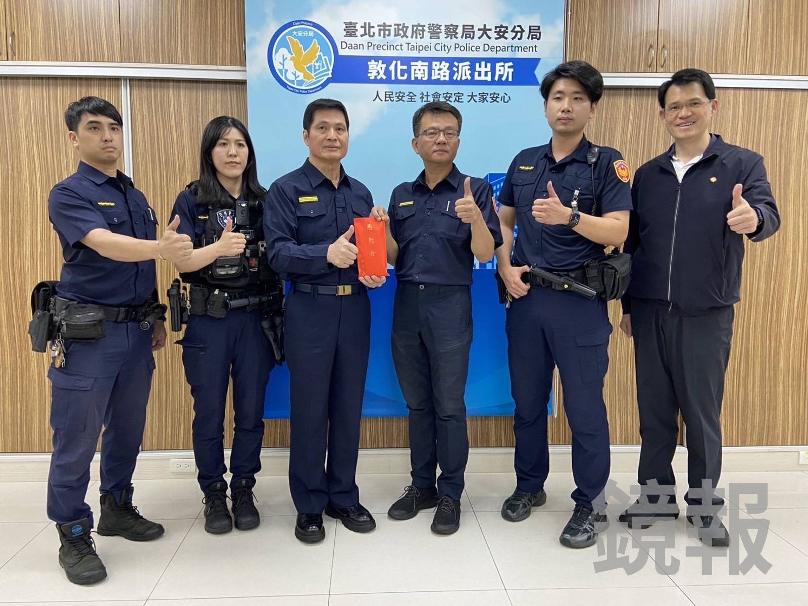 北市警察局長林炎田前往敦南派出所頒發20萬獎金,稱讚所長呂政隆(右三)及現場3位同仁膽大心細;最右為分局長劉全原。北市警提供