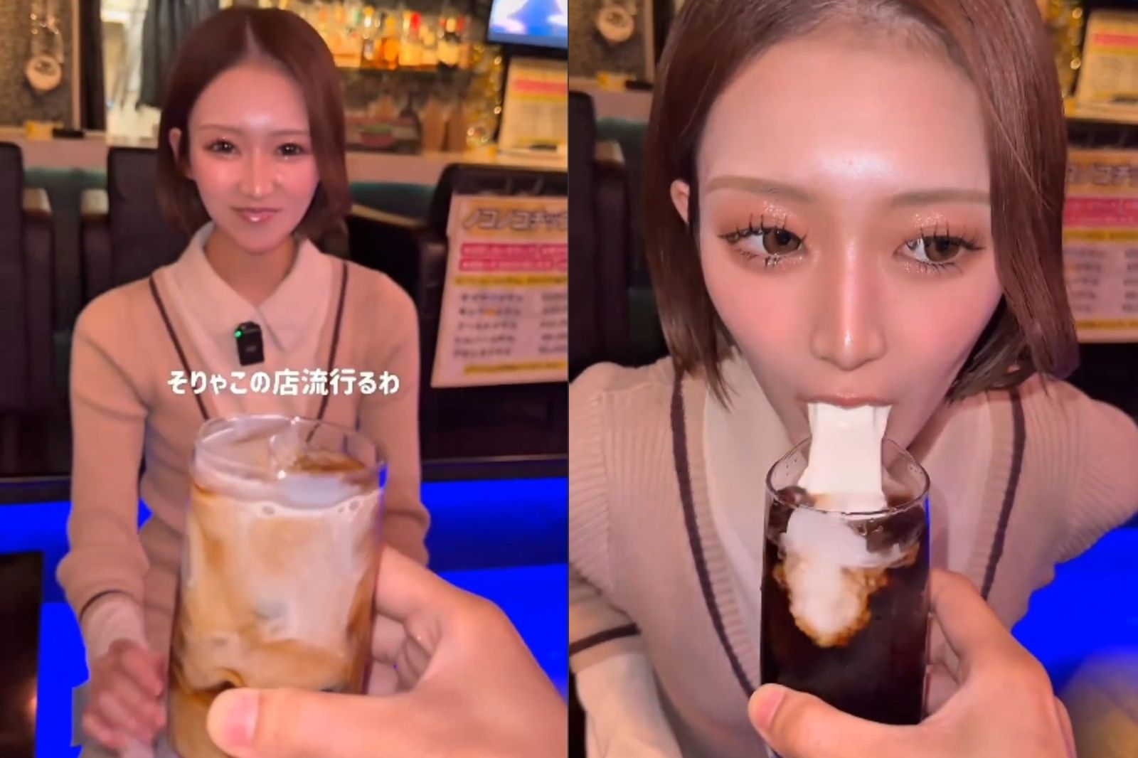 日本知名爆料系網紅「滝沢ガレソ」近日轉發這段16秒的爭議影片,畫面可見,一名外型亮眼、留著俏麗短髮的女店員先端上一杯冰咖啡,當顧客詢問為何沒有加奶時,她竟面不改色地彎下腰,將臉部貼近杯口,隨後將口中含著的白色牛奶直接「噴吐」進咖啡中,瞬間完成一杯「人體特製拿鐵」。