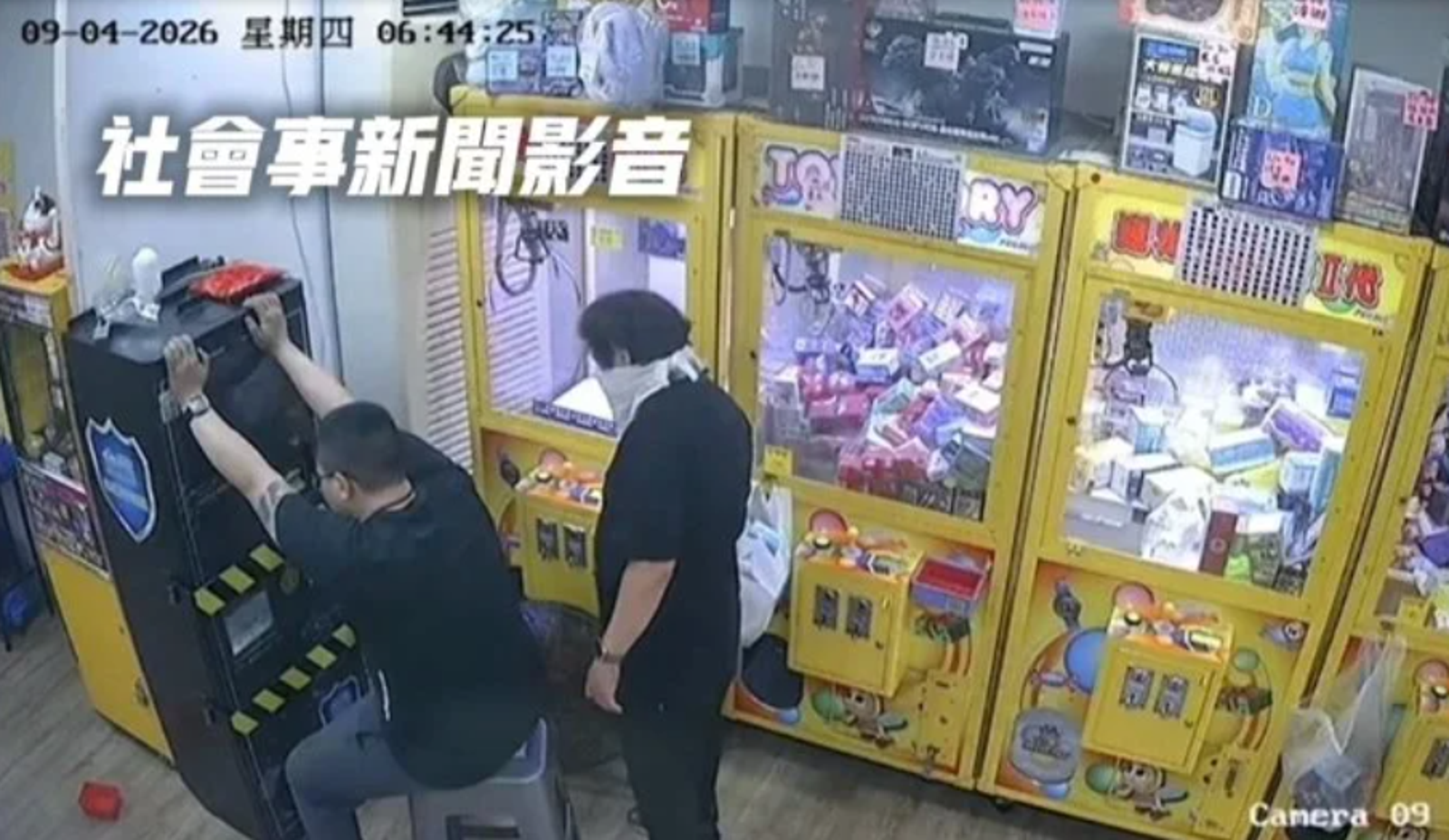 9日清晨6時許,33歲查姓男子與27歲李姓男子闖入台南市南區新興路一間夾娃娃機店。監視器畫面顯示,其中一人甚至用毛巾蒙面,試圖增加神祕感,但他們的技術顯然跟不上裝備。