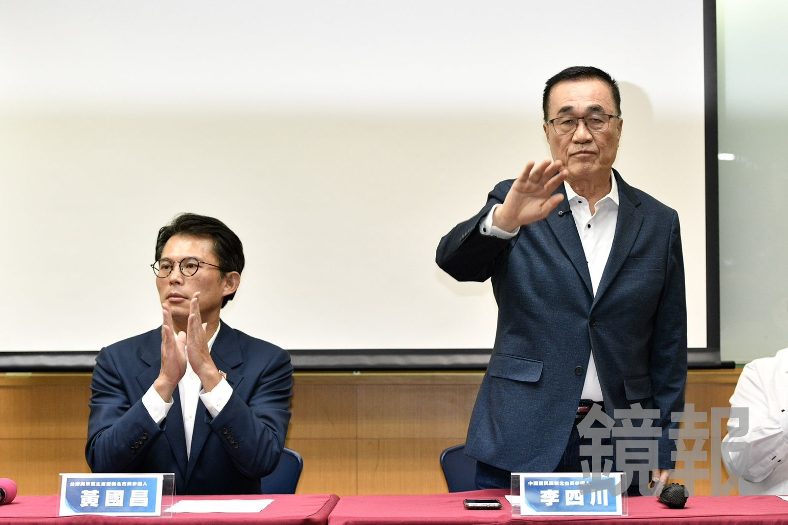 國民黨、民眾黨今天下午2時15分在台大校友會館舉行記者會宣布初選結果,李四川和黃國昌抵達現場後,先是到會議廳旁的小房間開會看民調結果,約到2時30分兩人才一前一後走進會場。