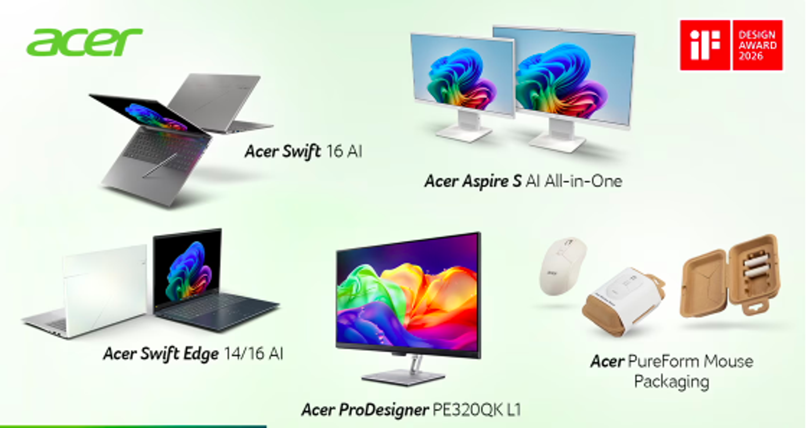宏碁宣布,旗下多項產品榮獲2026年iF設計大獎肯定,今年獲獎產品涵蓋多個產品類別,包括Swift 16 AI筆記型電腦、Swift Edge 14/16 AI筆記型電腦、 ProDesigner PE320QK L1螢幕、Aspire S AI All-in-One桌上型電腦,以及PureForm滑鼠包裝設計。