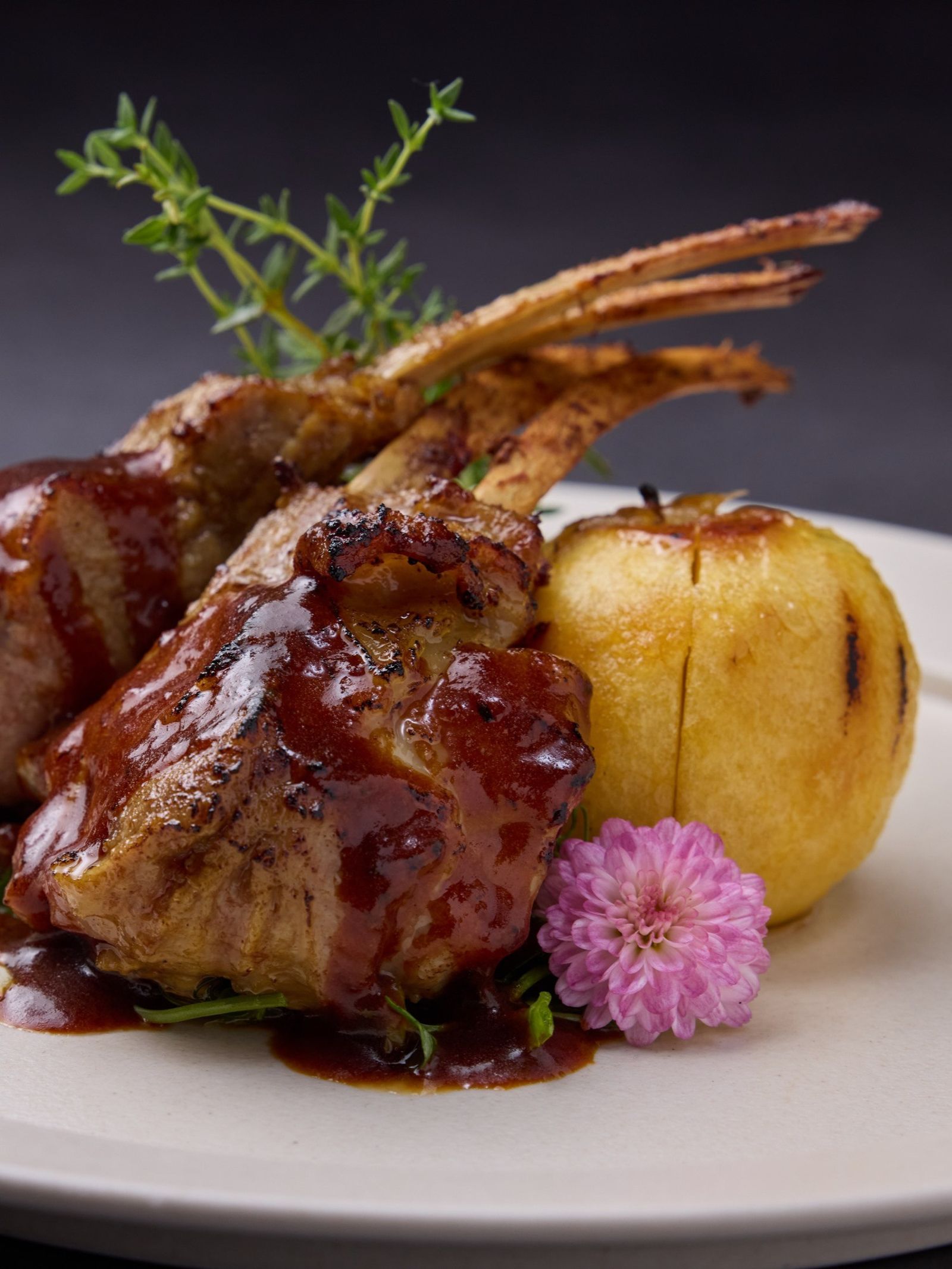 重口味饕客則不可錯過「小牛戰斧佐紅酒醬」(888元/份)。選用3個月以下小犢牛戰斧排,先以自製沙嗲醬醃烤,再淋上融合紅酒、蘋果、夏枯草的濃醇醬汁,外酥內嫩、果香裊裊。佐以焦糖烤蘋果點綴,甜中透出涼茶氣息,兼具視覺與味覺享受。