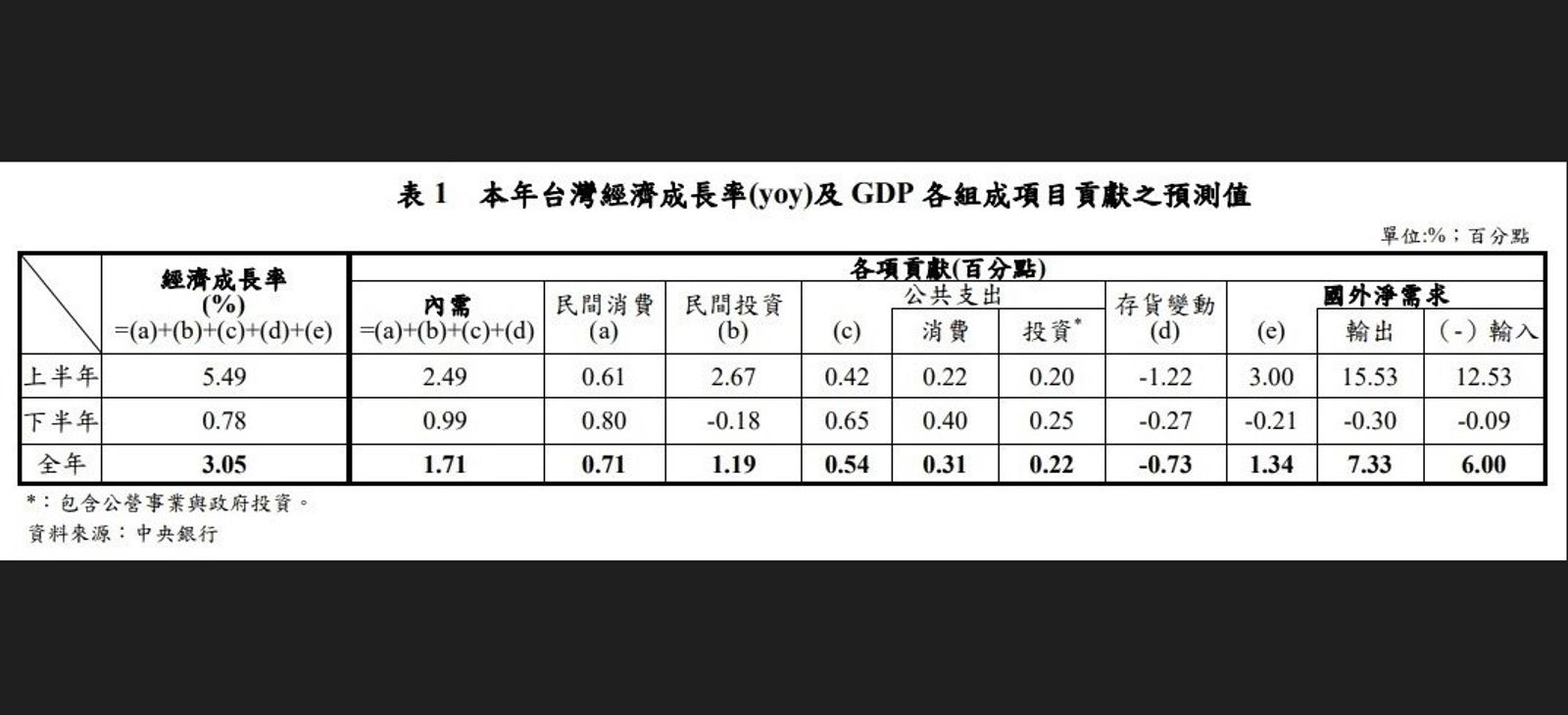 地緣政治風險也使得全球投資、消費等降溫,這也影響終端需求與廠商生產活動,加上中國大陸產能過剩持續,拖累傳產貨品的復甦步調。同時,下半年全球景氣下行風險高,部分廠商接單的不確定性高,未來投資意願可能下降,民間投資將呈現負成長,均使下半年經濟成長動能轉弱,預估下半年經濟成長率為0.78%,央行權衡計算預測國內經濟成長率將為3.05%,之後會採滾動式檢討,逐季調整經濟展望。