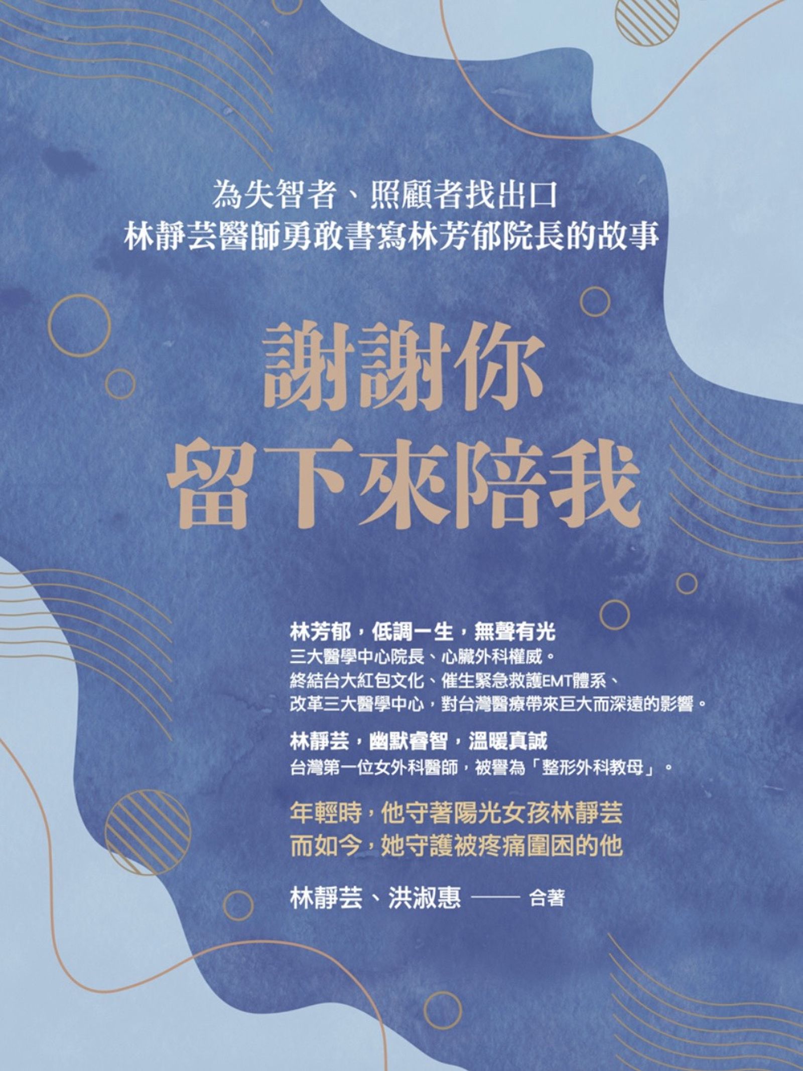 「心臟外科權威」林芳郁曾是眾人敬仰的醫師、院長、署長,他的醫術、管理能力與誠信在醫界有口皆碑。但突如其來的疾病,讓他轉換成另種身份:失智症患者。而最了解他的太太林靜芸,也從「整形教母」轉變成照護者,她把艱難受挫的照護歷程,寫成新書《謝謝你留下來陪我》,除了拯救自己,也希望帶給失智者家人力量和信心。