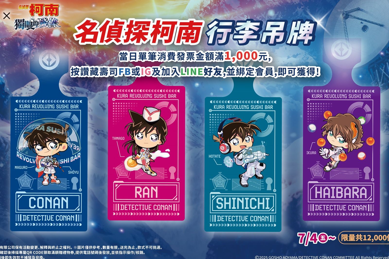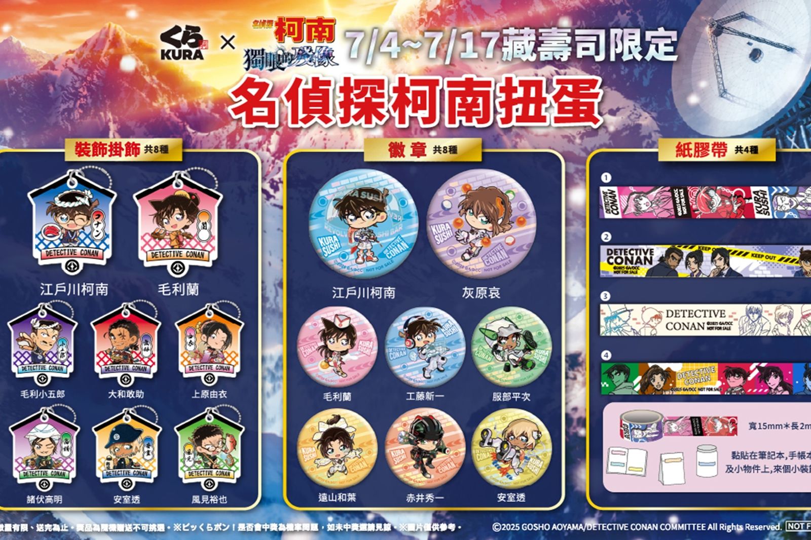 《名偵探柯南:獨眼的殘像》劇場版即將上映,「藏壽司」特地攜手柯南推出聯名扭蛋與滿額贈活動,包含20款限定扭蛋,還有4款角色行李吊牌,另外還有9道全新夏日料理也同步開賣。活動從7月4日開跑,只到7月17日止。