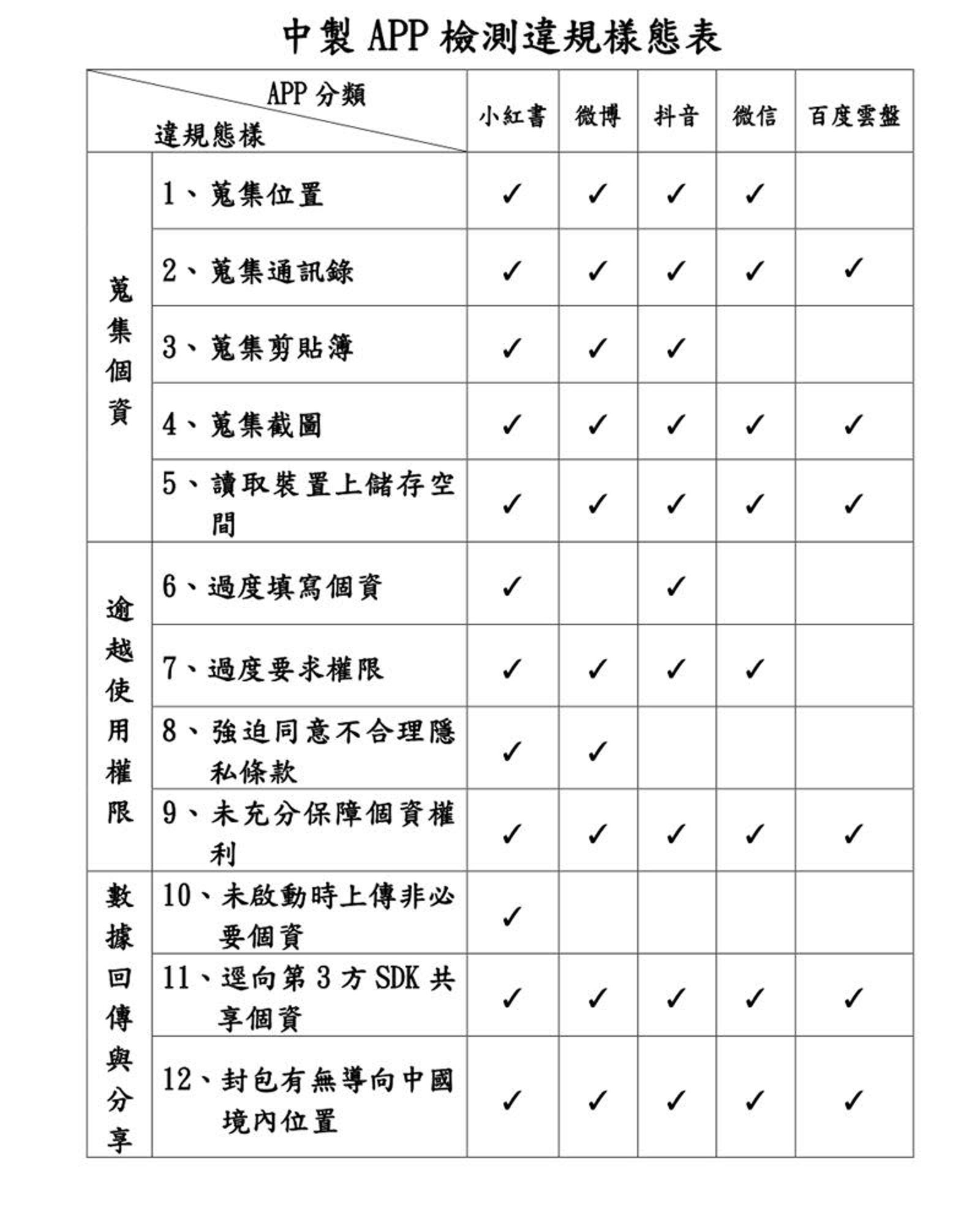 國安局表示,本次抽驗的中製APP,包含「小紅書」、「微博」、「抖音」、「微信」及「百度雲盤」等5款國人熟悉的應用程式。法務部調查局及警政署刑事局採用數發部發佈「行動應用APP基本資安檢測基準v4.0」相關指標,針對「蒐集個資」、「逾越使用權限」、「數據回傳與分享」、「擷取系統資訊」及「掌握生物特徵」等5類違規樣態所涵括的15項評鑑指標,逐一進行驗測分析。