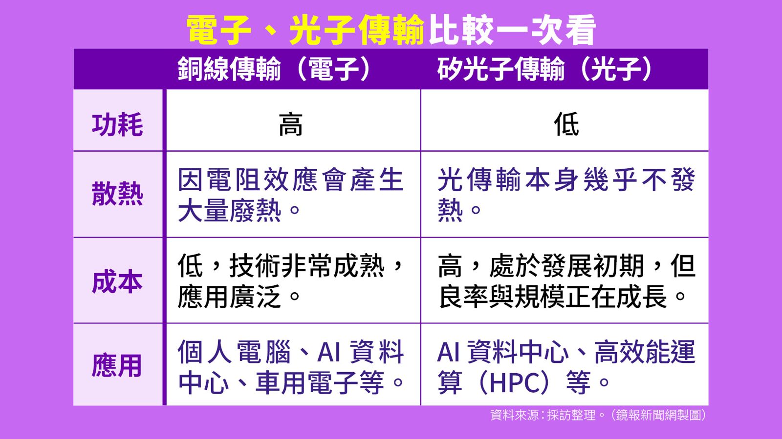 「我們把大量的能源浪費在傳輸這件事上。」業者分析,相較於現行以銅線為主的傳輸方式,矽光子技術可使資料傳輸量提升8倍、節省50%功耗,並增加30倍以上的算力。透過先進半導體技術,將光學元件與電子電路封裝在同一塊矽晶片上,這讓AI發展最重要的數據,不再需要以「電子」形式在銅線中蹣跚前行,而是轉換成「光子」,在幾乎沒有阻力、極低損耗的光波導中,以光速狂飆。