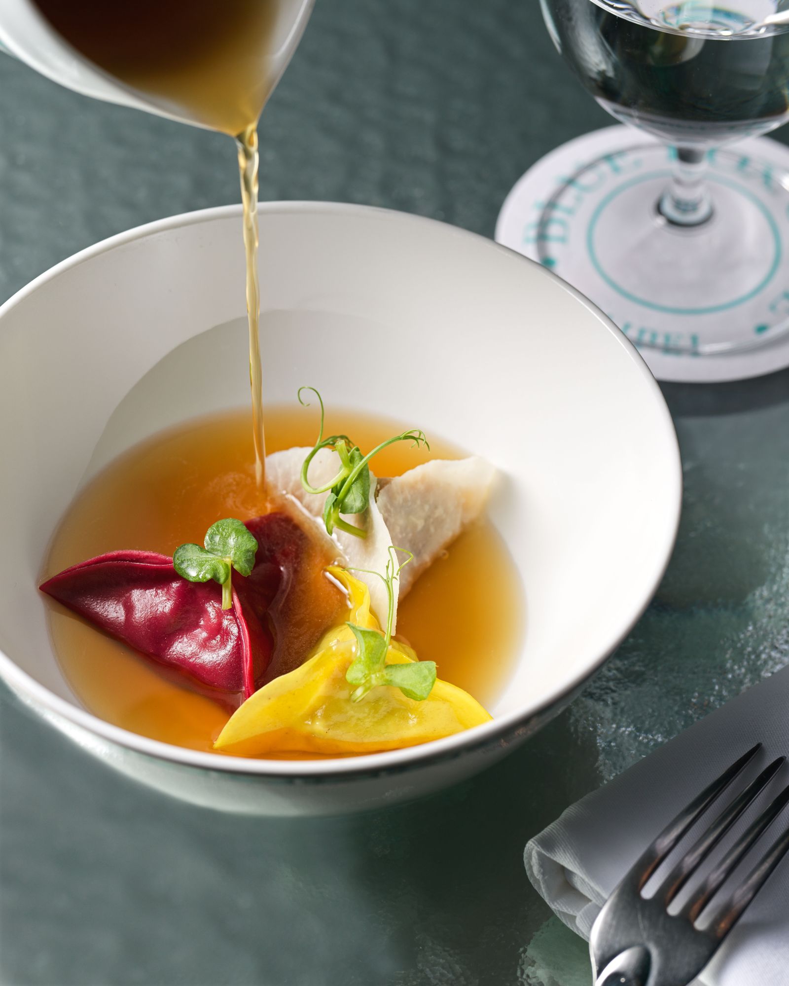 「雞肉澄清湯 餃子三重奏」則超有創意,三色餃皮包入剝皮辣椒雞肉餡,放進金黃雞湯裡,顏值高又有層次。