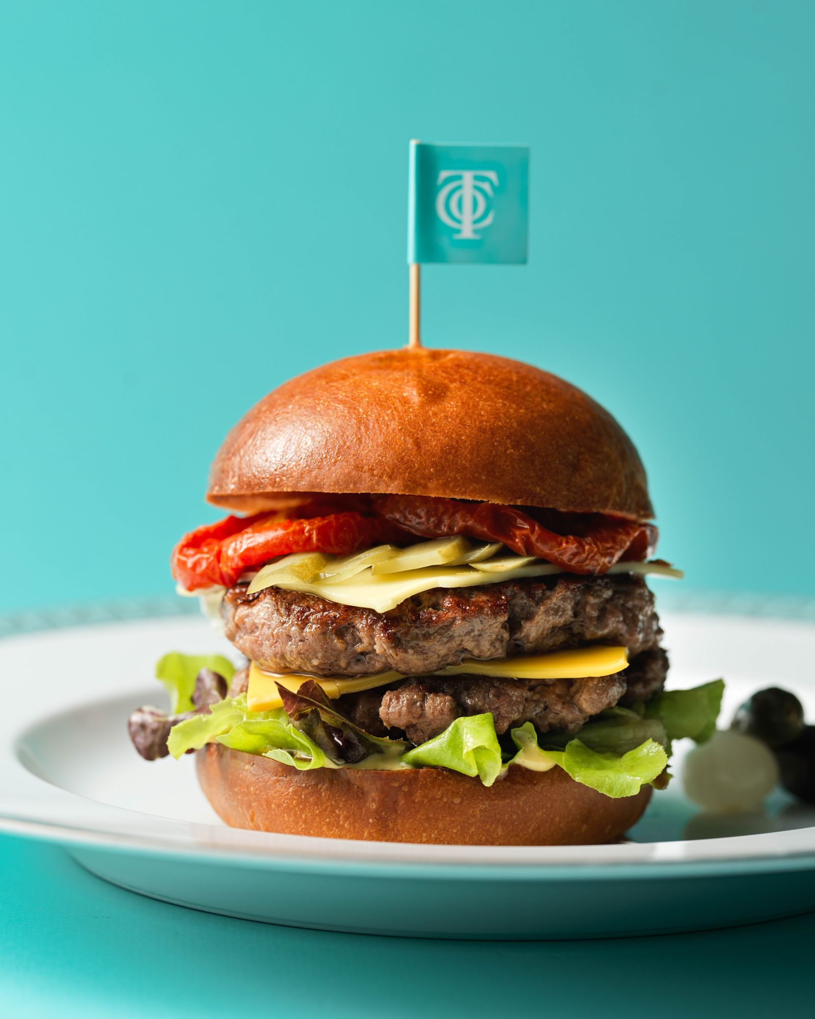 豪華上桌的「和牛漢堡」,搭配酸黃瓜、特製芥末籽醬,肉汁、鹹香、微嗆一次到位!