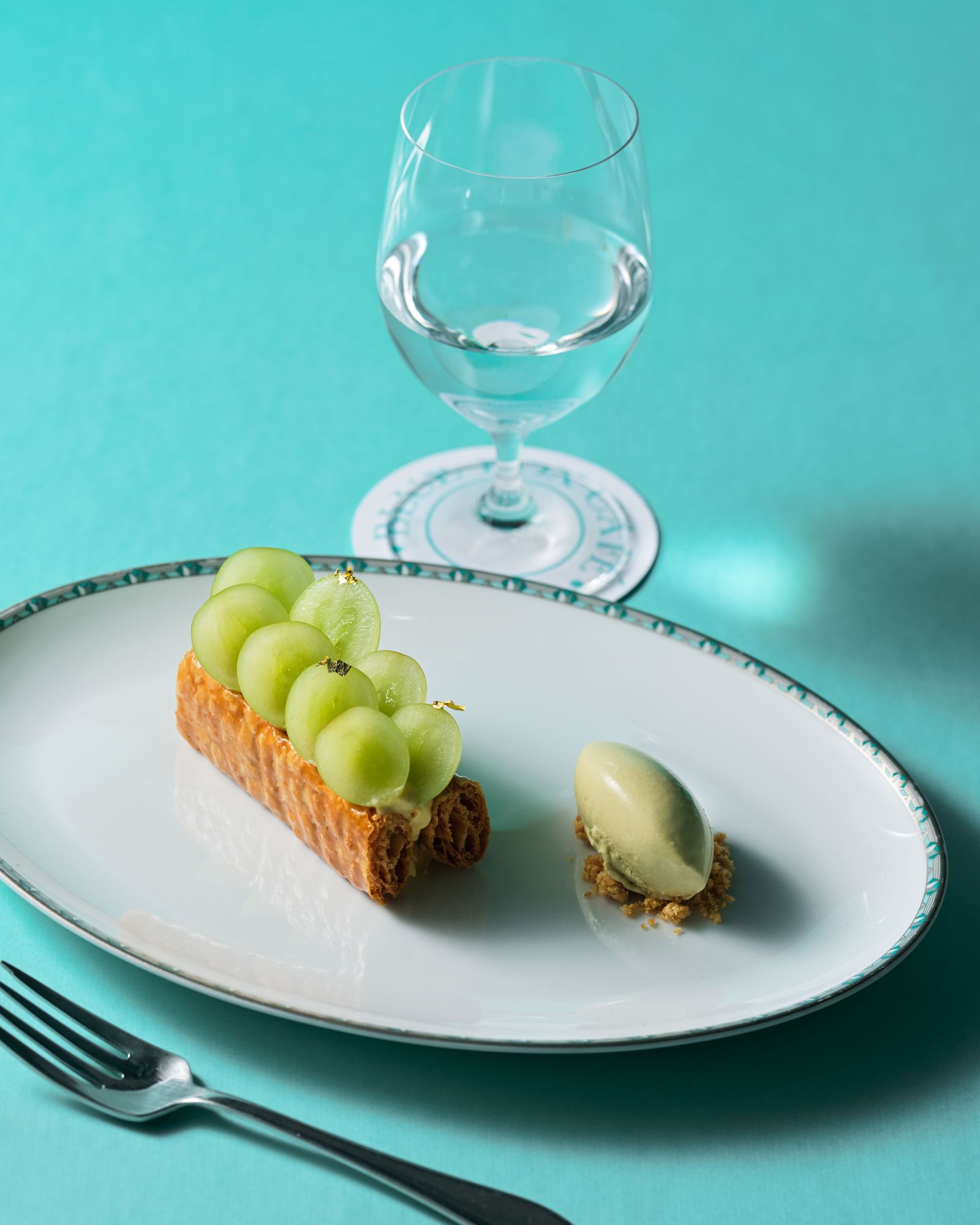 「麝香葡萄千層」夾入英式奶醬與四季春茶雪糕,優雅又清爽。整份菜單從前菜到甜點,不只顏值高,味道也有驚喜,讓人吃得輕盈又滿足。
