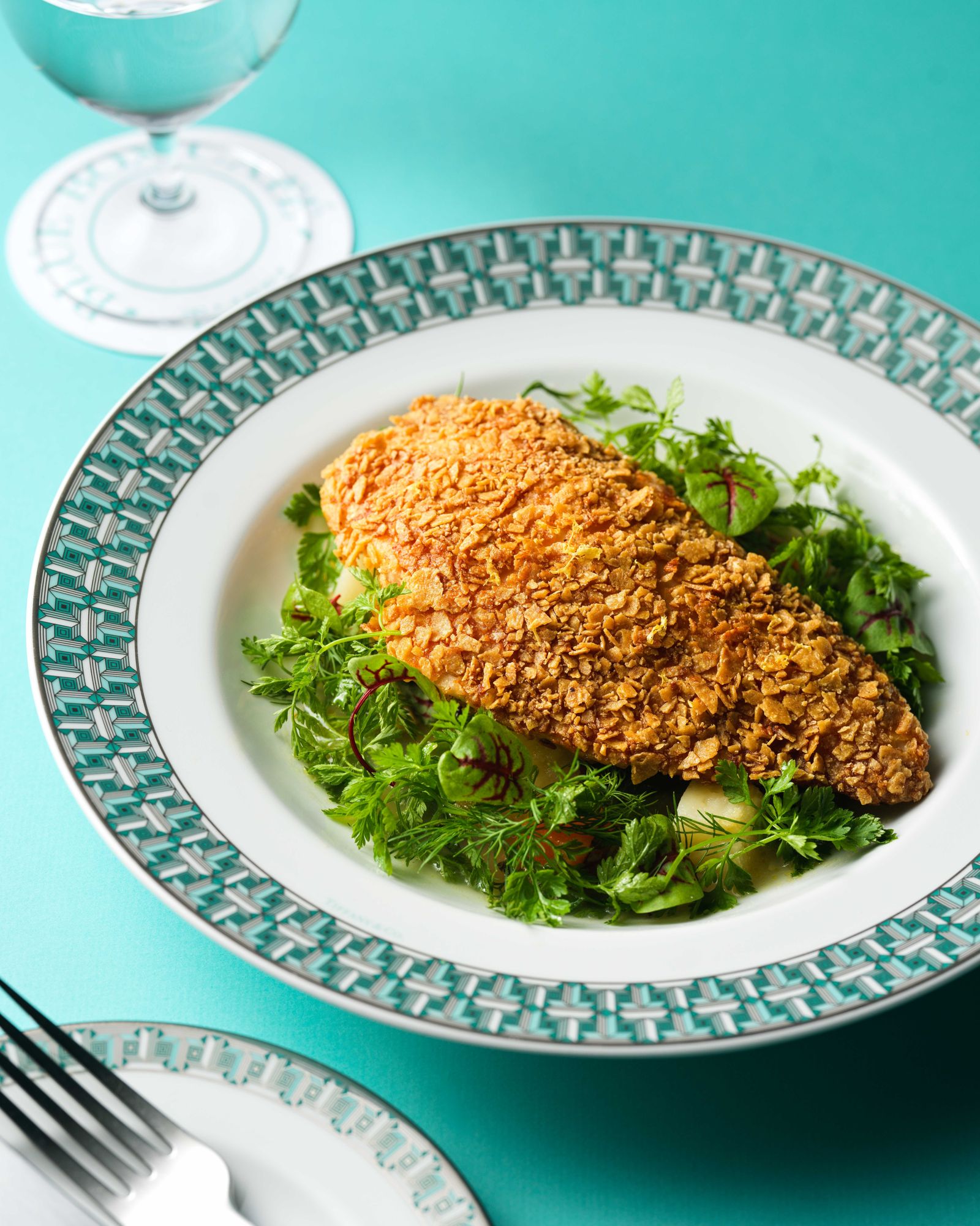 「墨西哥脆皮雞胸」表皮裹玉米脆片,煎得酥香,配檸檬燉馬鈴薯清新又特別。