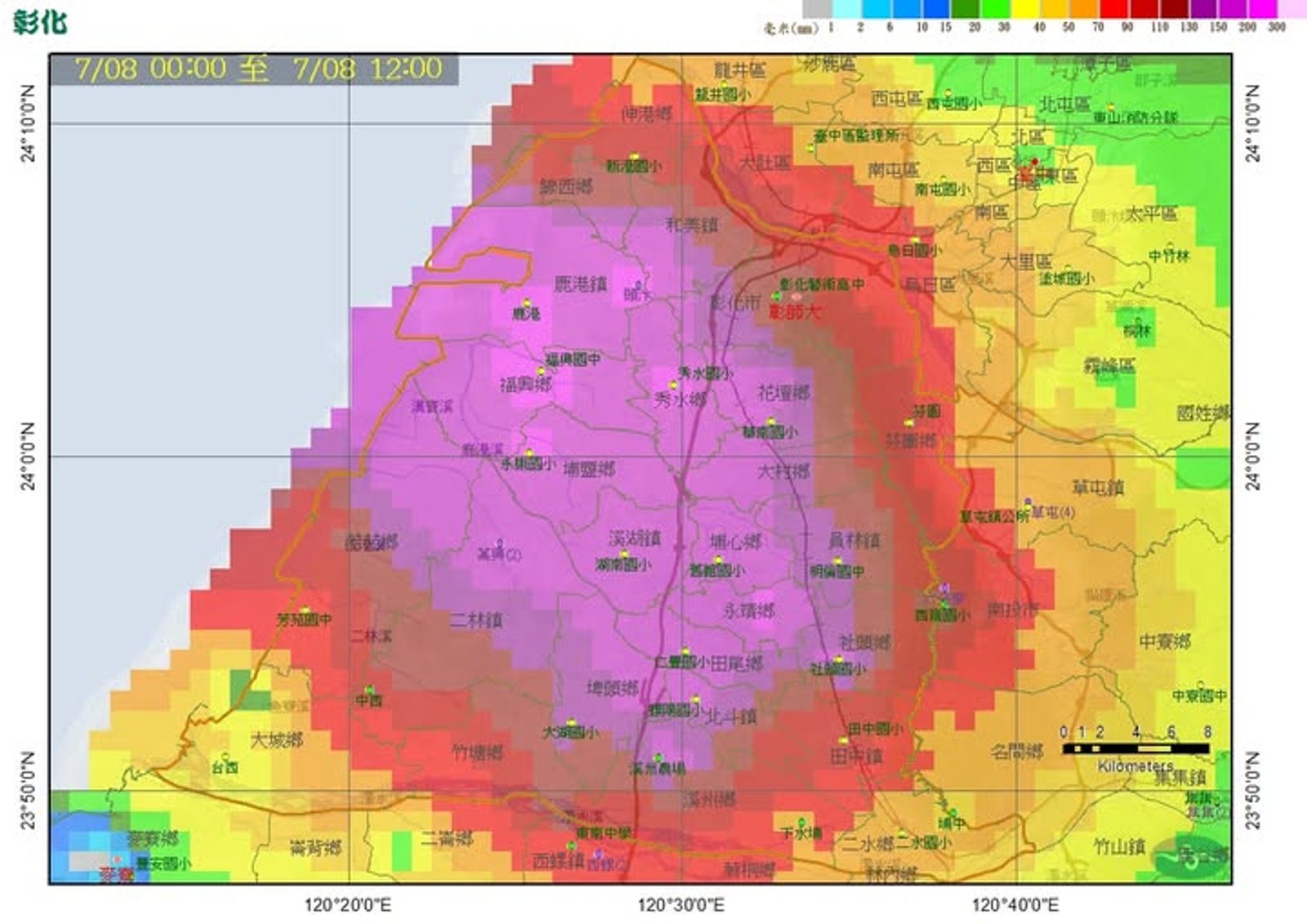 今日(7/8)中央氣象署多次對彰化發布大雨、大雷雨特報,根據資料,全國降雨量前19名的鄉鎮也都在彰化,降雨量十分驚人,多處淹水,就連前氣象局局長鄭明典都忍不住發文呼籲:「彰化縣可能需要周邊縣市的支援防、救災!」